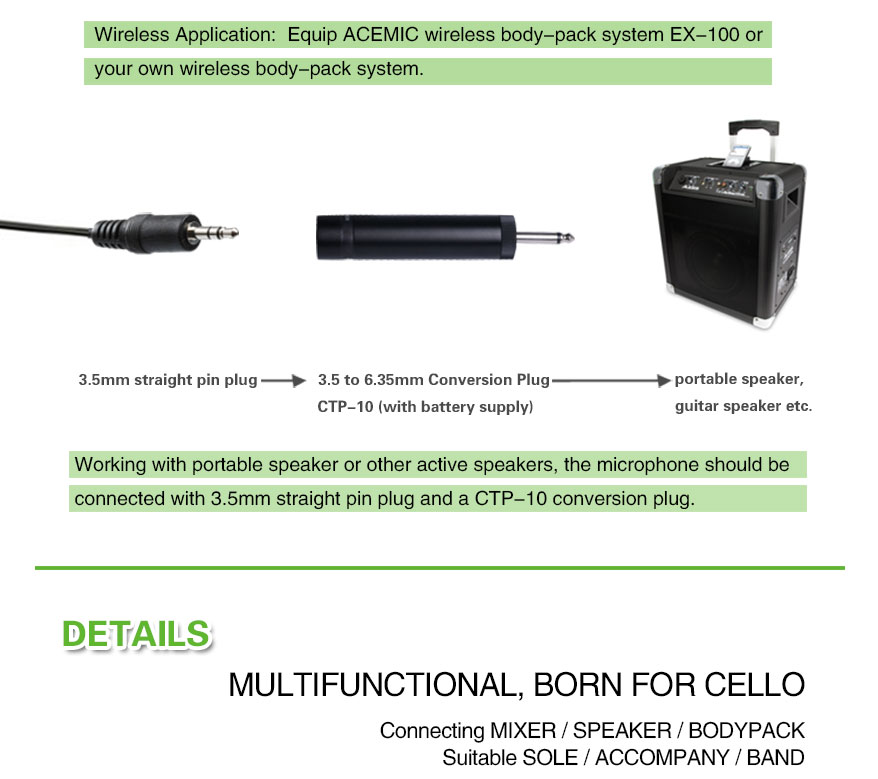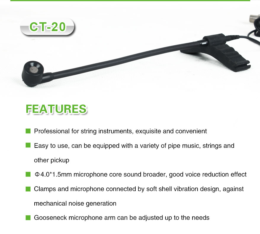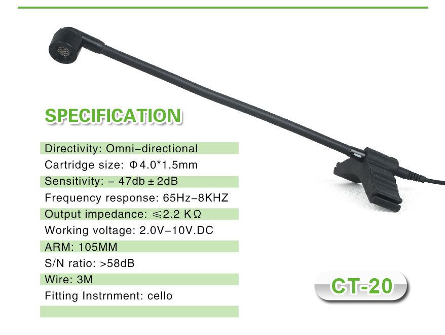 Microphone type: CondenserDirectivity: UnidirectionalCartridge size: Φ4.0*1.5mmSensitivity: - 47db±2dBFrequency response: 65Hz-8KHZOutput impedance: ≤2.2 kΩWorking voltage: 2.0V-10V.DCARM: 105MMS/N ratio: >58dBCable length: 1.2m standard, 3m optionalFitting Instrument: CelloThe CT-20 Wired Cello Microphone is a premium-grade condenser microphone designed specifically to capture the rich tonal characteristics and subtle nuances of the cello. Whether you’re a solo performer, recording artist, or orchestral cellist, the CT-20 is engineered to deliver pristine sound reproduction that faithfully represents the natural voice of your instrument.