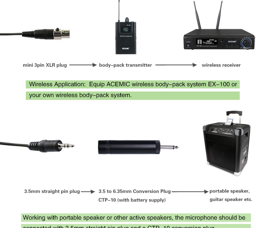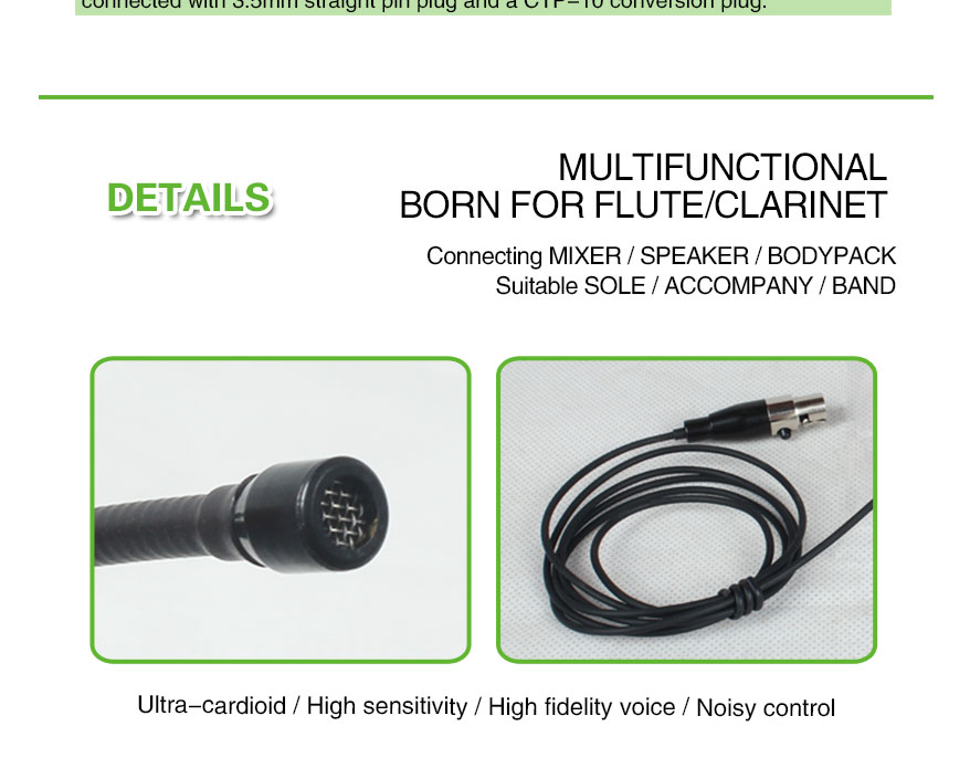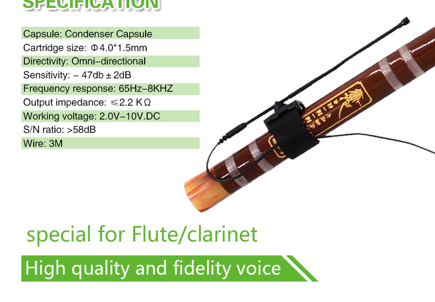 Microphone Type: CondenserCartridge size: Φ4.0*1.5mmDirectivity: Omni-directionalSensitivity: - 47db±2dBFrequency response: 65Hz-8KHzOutput impedance: ≤2.2 kΩWorking voltage: 2.0V-10V.DCS/N ratio: >58dBCable length: 1.2m standard, 3m optionalFitting Instrument: Flute, Piccolo, Clarinet