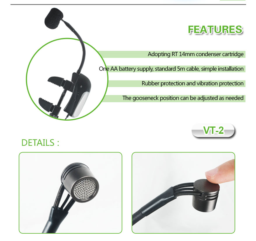 Capture the full resonance and rich tones of your violin with the VT-2, a professional-grade wired violin microphone designed to deliver exceptional clarity and precision. Whether you're performing live on stage, recording in the studio, or practicing, this wired violin microphone ensures your instrument's natural sound is faithfully reproduced.With a tailored frequency response and cardioid pickup pattern, the VT-2 wired violin microphone minimizes background noise and isolates the violin’s sound, providing a clear and natural recording. Its lightweight and secure mounting system makes for easy setup without interfering with your performance.