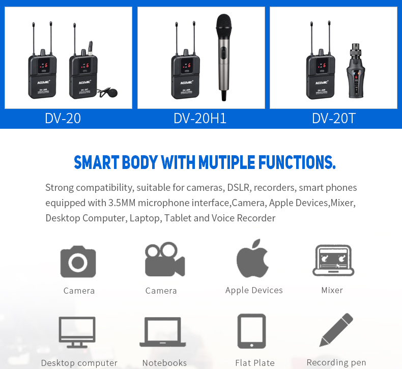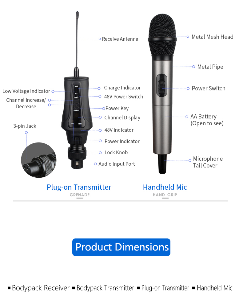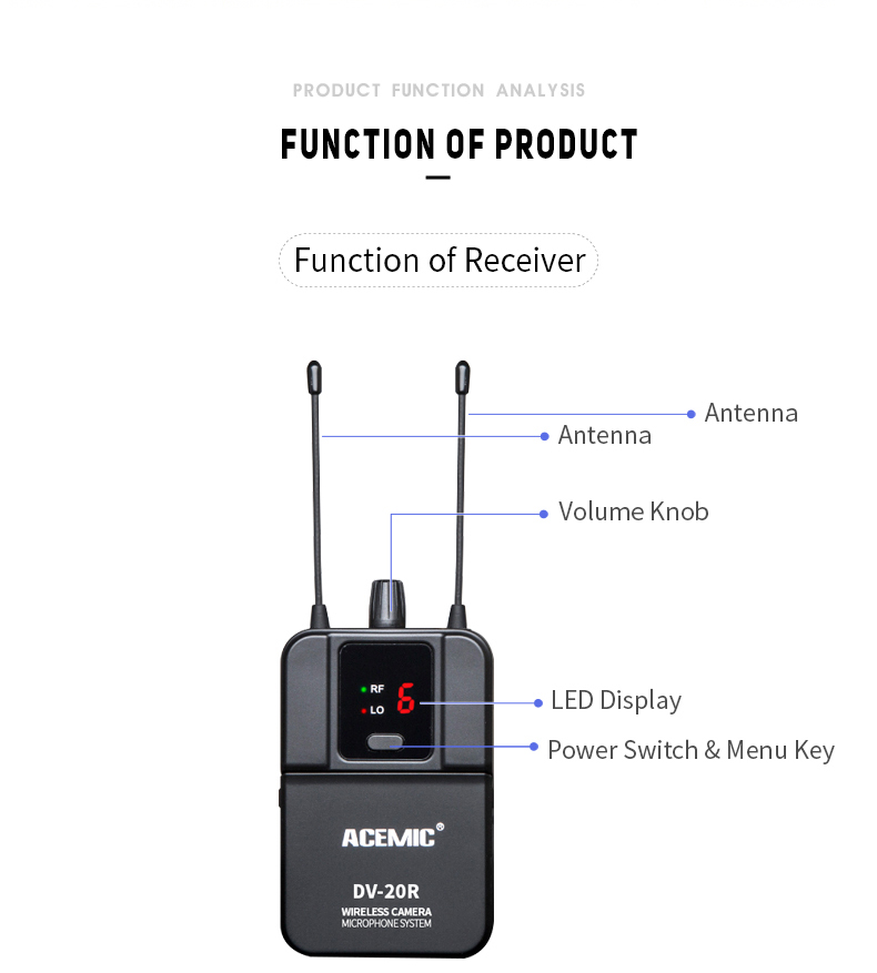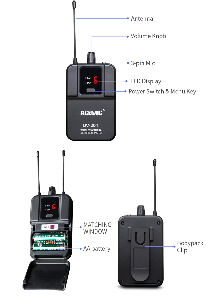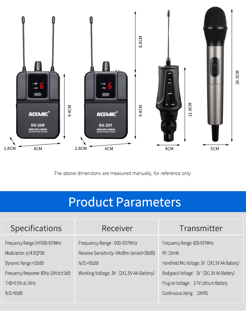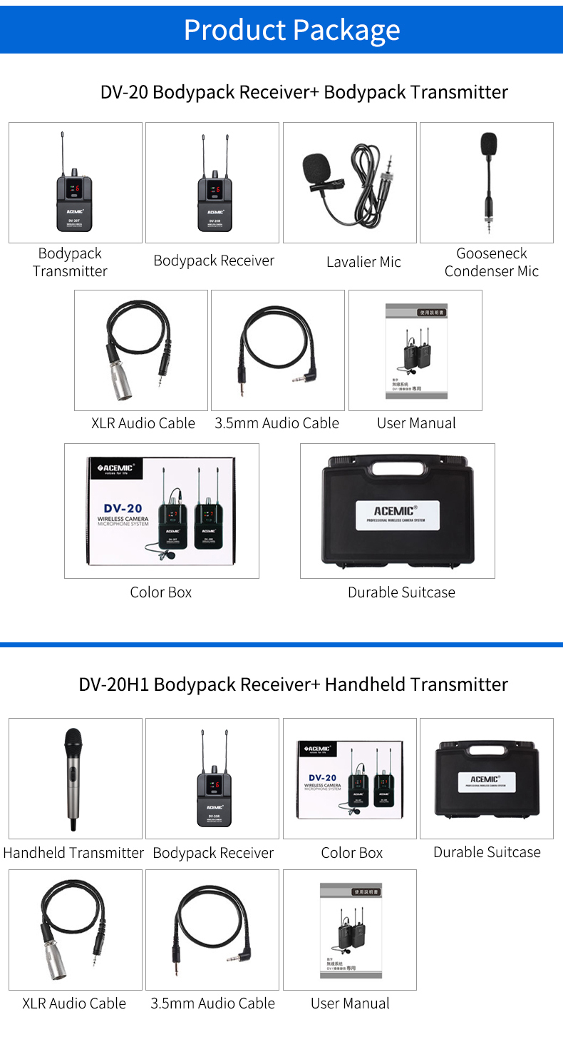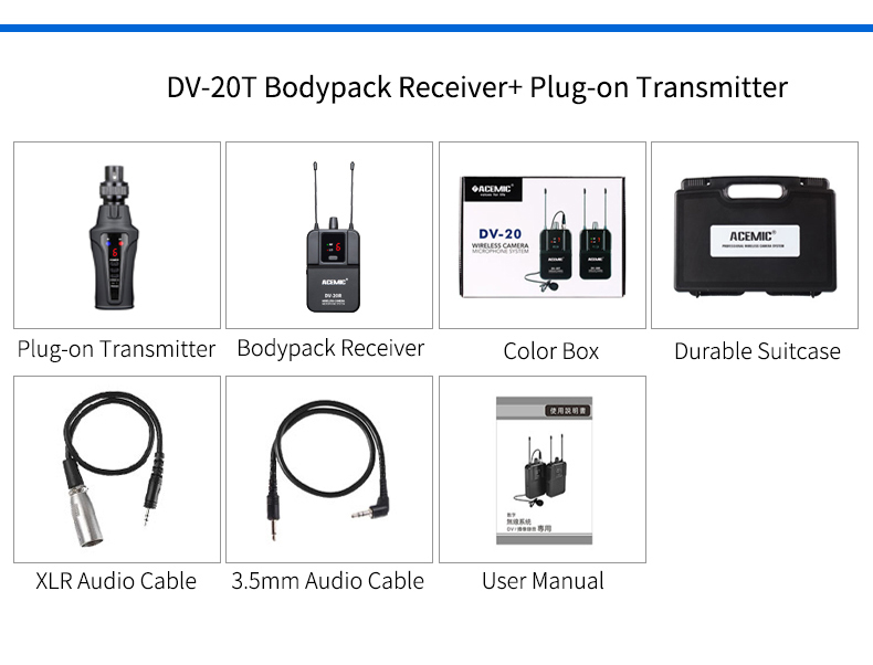 • Compatible with All : Receiver with 3.5mm interface, comes with two 3.5mm cable, the wireless camera microphone can work with your laptop/PC/DSLR Camera/Amplifier/DV/Camcorder/Smart phone/Mixer, etc.