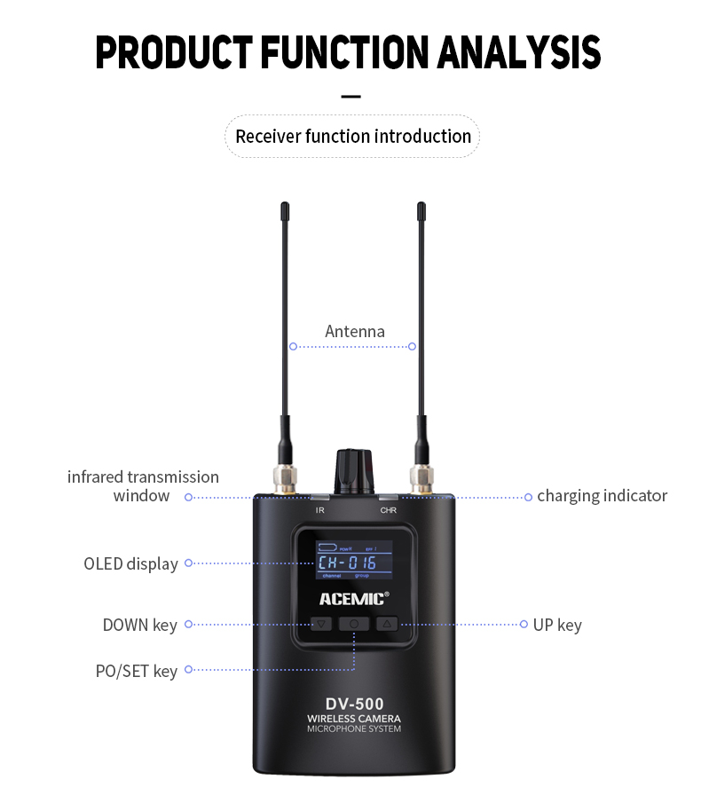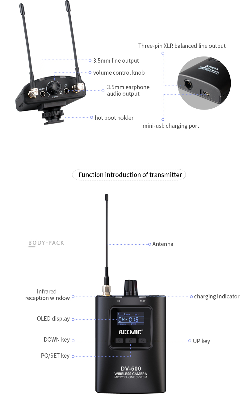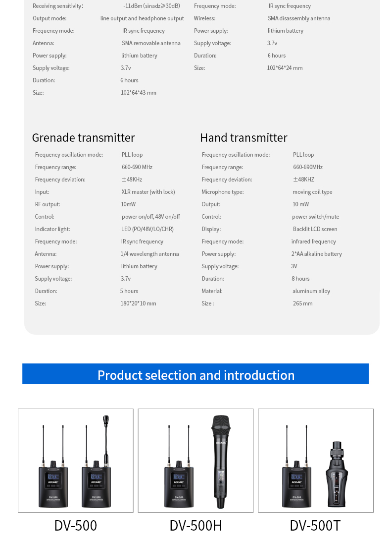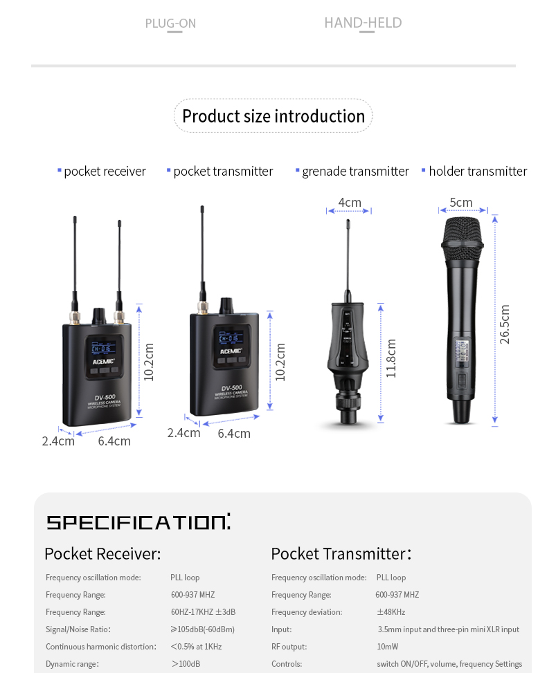 SpecificationsFrequency Range: UHF 600-937 MHz (region dependent)(606-630 MHz Optional), (USA: 902-928, UK: 863-865, ROK: 925-937 MHz)Body-pack ReceiverFrequency Preparation:PLL Synthesized ControlFrequency Range:UHF 660-690MHz (USA: 902-928MHz)Frequency Response:60Hz-17KHz+/-3dBS/N Ratio:≥105dBT.H.D:<0.5% at 1KHzDynamic Range:>100dBChannels:100Receive Sensitivity:-11dBm (sinad≥30dB)Output:3.5mm line out and earphone outControls:Power ON//OFF, Volume, SET frequencyInterface:InfraredAntenna:SMA Detachable antennaPower Supply:Lithium batteryOperating Voltage:3.7VOperating time:6hDimensions( L*W*H):102*64*43mmBody-pack TransmitterFrequency Preparation:PLL Synthesized ControlFrequency Range: UHF 660-690 MHz