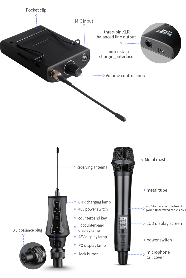 About this item:【Superior Sound & Noise Reduction】The wireless camera microphone features UHF Ultra High-Frequency radio wave technology and dual-antenna design, which enhances the anti-interference ability to ensure stable signal transmission and record clear sound. It features intelligent noise reduction function, can significantly reduce environmental and wind noise.【Wide Compatibility】You can mount the receiver to DSLR Camera, XLR Camcorder, iPhone, Android smartphone, Laptop and PC. The wireless camera microphone is widely used for YouTube live streaming, Vlog recording, interview, program hosting, podcast, presentation, church, wedding.【100 Selectable UHF Channels】The wireless camera microphone package includes 1 Receiver+2 transmitters, so the DV-500Dual support 1-2 people recording at the same time. Every transmitter can select 2 channels, flexible channel matching. When other channels are disturbed in the same space or near distance, you can quickly switch the channel to prevent interference. Working range of the microphone system up to 164 feet (50 meters) in open areas.【Charge and Work Time】The transmitter and Receiver are built-in 1000 mAh rechargeable lithium-ion batteries that can offer about 6-8 hours working time. USB cable has several mini USB for charge for the transmitters and receiver at the same time, fully charge is only 2.5 hours. The red light is on during charging and goes off when fully charged.【Real-time Audio Monitoring】Connect your favorite headphones to the receiver's 3.5mm headphone jack, you can listen the sound while recording, and monitor the audio status to complete the recording at one time. Daylight-readable displays on the transmitters show volume, battery status and channels. The wireless camera microphone's display on the receiver show connection quality of every transmitter and battery status.