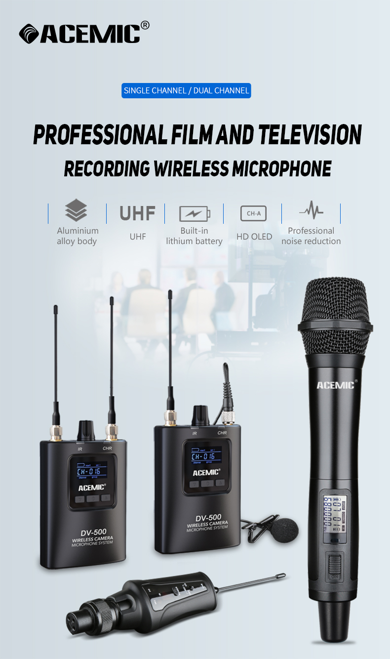 Customer Reviews K**e K**eGreat quality. Works great. Affordable product at great quality.  Gre*******ekke Gre*******ekkeImpressive! I've used the other big name wireless lavalier mics extensively for over a decade but when I decided to branch out into independent news production it was hard to stomach the price... Not only that, having a dual mic option for interviews was always a pain with two transmitters and two receivers. This ACEMIC system seems just as rugged, is rechargeable and the sounds is every bit as good as produced by the two other brands I've used that start with the letter 'S'. I think the quality of sound at range is even BETTER than the S-named brands - no breaking up or loss of signal when the transmitter/receiver combo is out of line-of-sight when recording at a distance of 50 meters. These have only been in my kit for a few months, so I can't remark on the long-term reliability of these units. I don't pixel peep my audio, so also can't comment on what sort of improvement could be made by adding a more expensive microphone - the ones that came with the kit sound good and clients (and their engineers) are pleased. I've fiddled a bit with the input range on the receiver to fine-tune the sound into camera and a setting of 12 seems to provide enough gain without blowing out the top end. For me, this ACEMIC kit is a no-brainer - easy to use, reliable an good sounding - all at less than half the price of two transmitter/receiver combos from the other major brands.  Er*****aty Er*****atyBuilt like a tank and great sound quality. As with every ACEMIC product I’ve purchased and reviewed, the quality standards of this system is second to none. The transmitters and receiver are built like a tank. Solid metal construction. Plenty of accessories for your every need. All conveniently contained within the included hardshell, foam-lined case. Needs no external batteries, so you don’t have to worry about extra spending on rechargeable A-style batteries. These units (transmitters and receiver) came nearly fully charged—it only took about an hour to charge all three units. And thanks to the included 3-way USB charger, you save loads of time charging them all at once.  Jan******ns Jan******nsDurable & Long lasting battery life. No problems. Batteries lasted longer than expected. More durable than expected. Great deal!  Bla******nut Bla******nutNot only do they feel sturdy but they are metal. Really impressed with this system. I have previously been using a Rode lav and Sennheiser wireless system. But I needed more lavs and didn't want to break the bank on more Sennheiser equipment. When the product arrived I taken aback with the quality and build of the 3 units. Not only do they feel sturdy but they are metal! The case they come in is really great. Ok lets talk about the audio quality, this was a big deal for me! I film weddings and need top notch audio I will not compromise on bad equipment or stuff that just doesn't work well. After comparing the audio from the ACEMIC vs my Sennheiser setup I can say with full confidence that the quality is almost the same if not better...crazy I know! The stock 2 lavs that come with the setup are great! I was thinking I would need to change them to something better, but I will definitely be using them. Signal was another thing that really mattered to me, will there be random audio drop outs, noise, etc. I did a short video test to see if a short distance maybe 100ft would cause any issues. It didn't which made me real happy! Overall Im really impressed and would highly recommend these to anyone!  Sylv********blay Sylv********blayExcellent product, very good price and excellent service! Before buying an expensive wireless lapel kit, I rented a Sennheiser wireless lapel mic set to test it and was just about to buy one. I then came across this ACEMIC DV-500Dual set. After reading some reviews and seeing some videos on it, I decided to give it a try. The price was almost half of the Sennheiser kit and included not one, but two transmitter sets (and all its accessories). Not only that, but the kit included a very nice and study case, which the Sennheiser was lacking. I was very pleasantly surprised by the ACEMIC set. The build quality is better than the Sennheiser (all metal vs some plastic on the Sennheiser), and the belt clip is much tighter than on the Sennheiser. The other major benefit for me is that it is rechargeable via the included USB cable. No need to switch AA batteries anymore! As far as sound quality, I was VERY impressed. No background noise at all and microphone really picks up the voice from a good distance. The ability to sync the channels between the transmitter and receiver via IR is also a nice touch. Sennheiser should learn from ACEMIC. ACMIEC’s kit offers much more for a lot less with comparable sound quality and superior build quality.