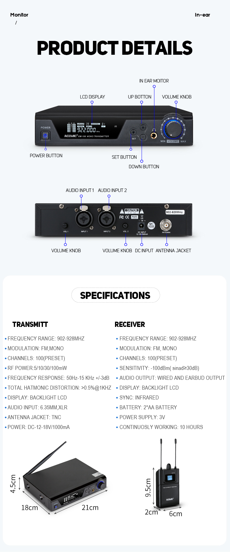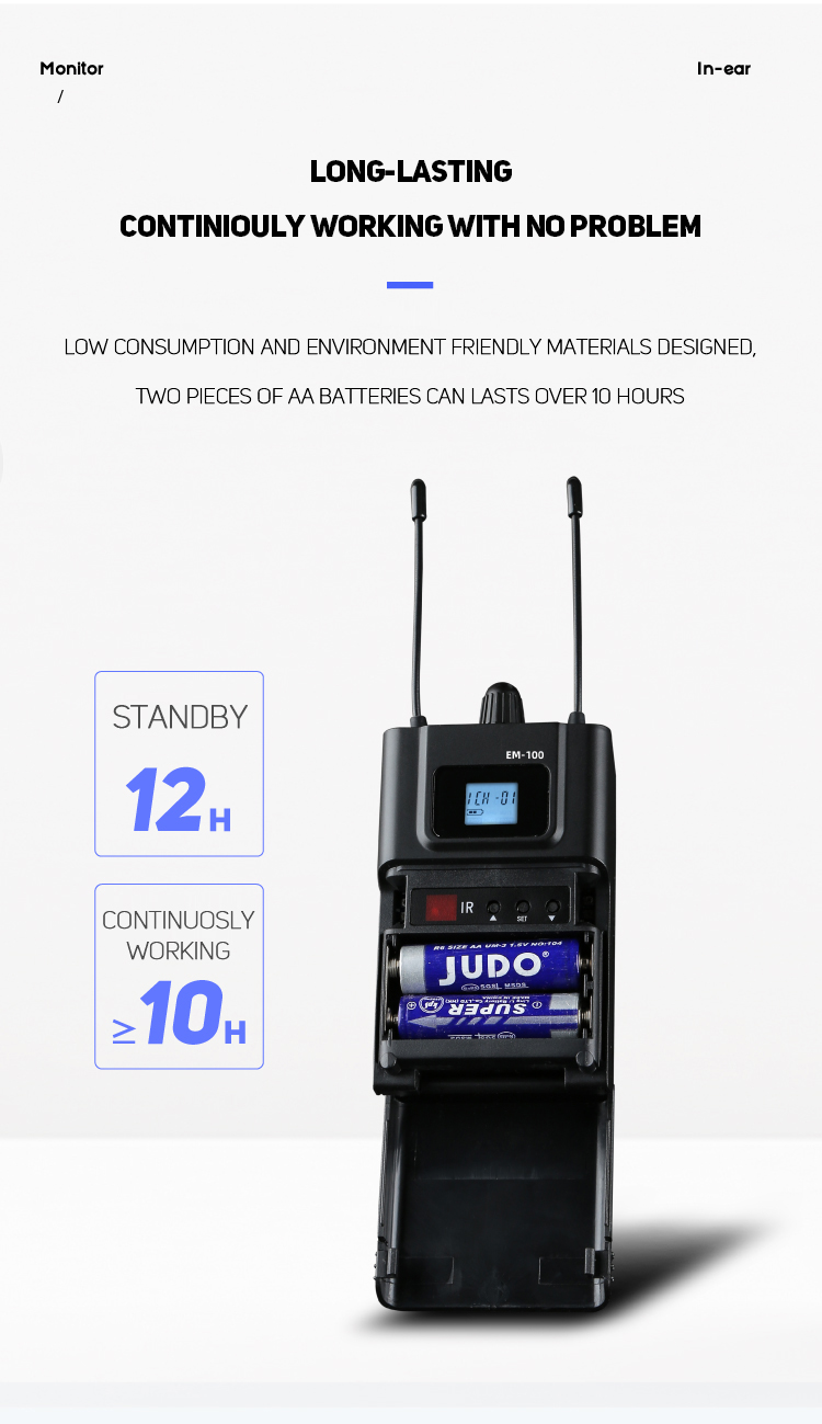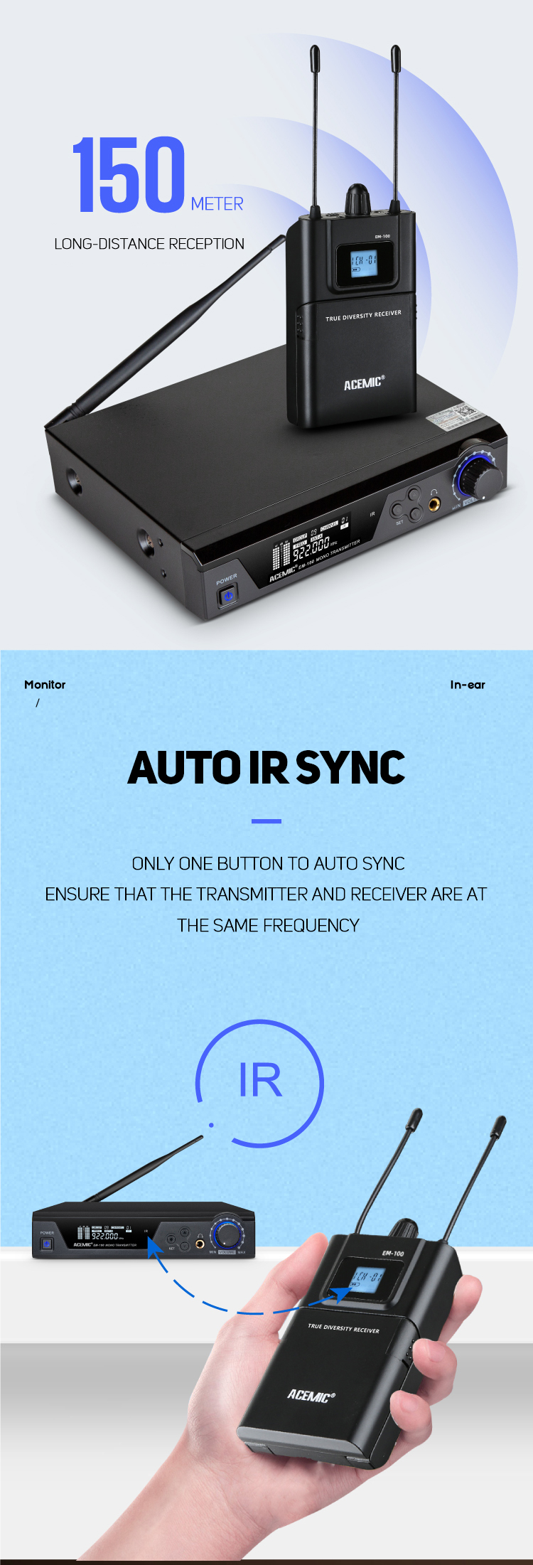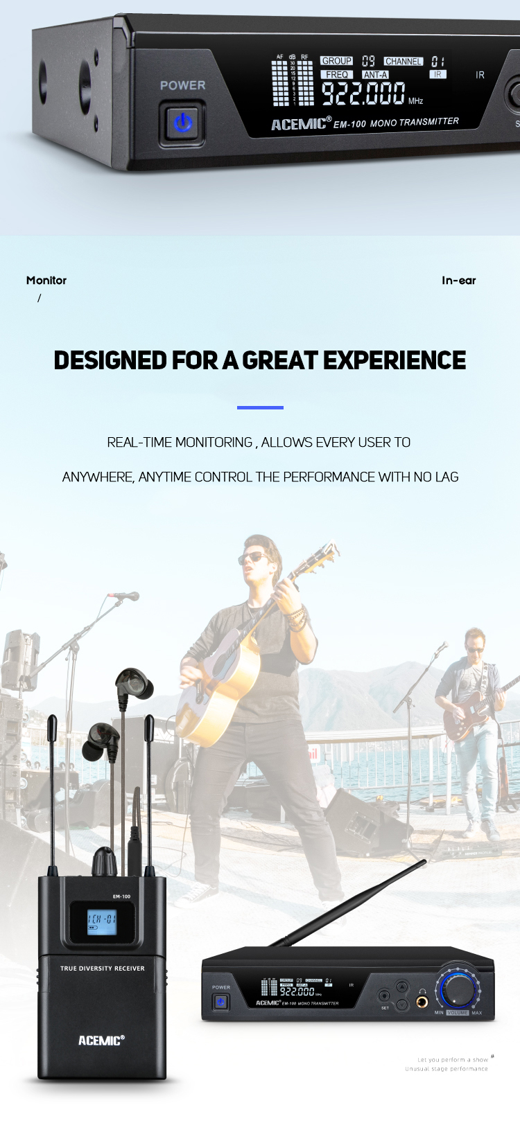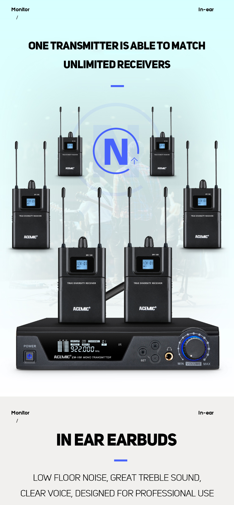 About this item:【Great UHF Band】This mono wireless in-ear monitor system uses UHF for enhanced performance. Strong, stable signal. 600 - 937 MHz. You can rest assured to use this wireless IEM system in any occasion. Broadcasts on 100 channels no-interference, Less than 4.5ms Latency(normal),Up to 90 dB signal-to-noise ratio provides clear, detailed audio at any volume. High Resolution 24-bit/48kbps audio. Broad 20Hz-20KHz frequency response, Dynamic Rang 105 dB.【High Sound Quality Reproduction】The wireless in-ear monitor system fits your personal or team's monitor system. uncompressed wireless signal transmission, low noise and latency. Provides smooth frequency response with any headphones. Using advanced circuit design, great chips, clear the receiving blind angle to make the system's receiving signal steady. True diversity enables users to move freely with 656ft (200m) operating distance in open space. Uncompressed wireless signal transmission, low noise and latency. Provides smooth frequency response with any headphones. For longer distance, please avoid thick walls, glass, and metal block.【Extensible Unlimited Receivers】 With one transmitter, no matter how many receivers are added, the receiver and transmitter can work properly as long as they have the same frequency. According to your needs, you can configure different numbers of receivers for various sound monitoring activities, stage performances, studio recordings, exhibitions, lectures, teaching, speeches, etc. The wireless in-ear monitor system also includes a standard rack unit that can be used for professional events such as stages.【You Would Get】UHF wireless IEM transmitter, bodypack receiver, in-ear earbuds, power adapter, antenna, Audio cable, metal Rack Mount, user manual.Devoted Service: Genuine wireless in-ear monitor system comes with 12-month manufacturer assurance and supportive customer service. Welcome to come to us for troubleshooting or replacement of discontinuous/defective parts.