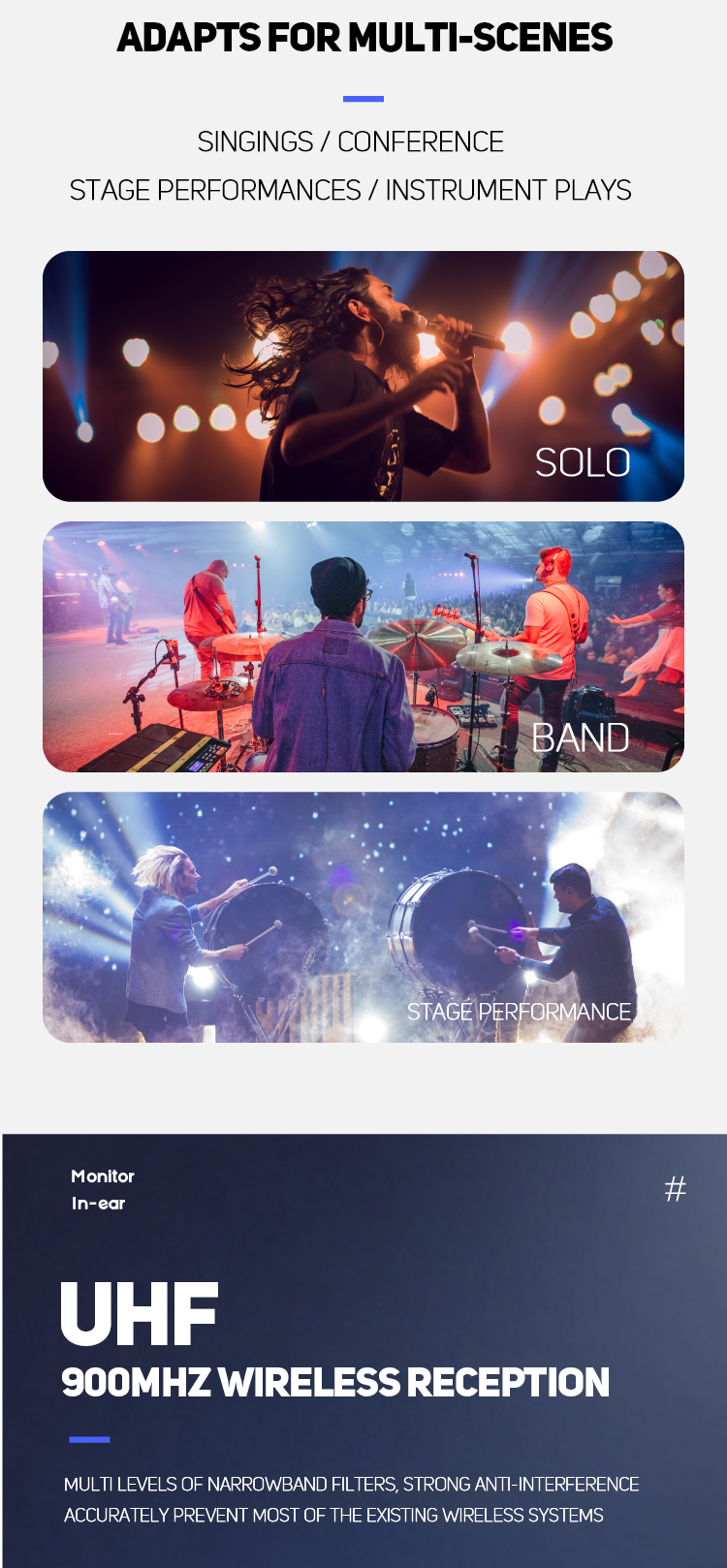 Designed for singers, musicians, stage performance, whole band, guitarists drummers, etc.