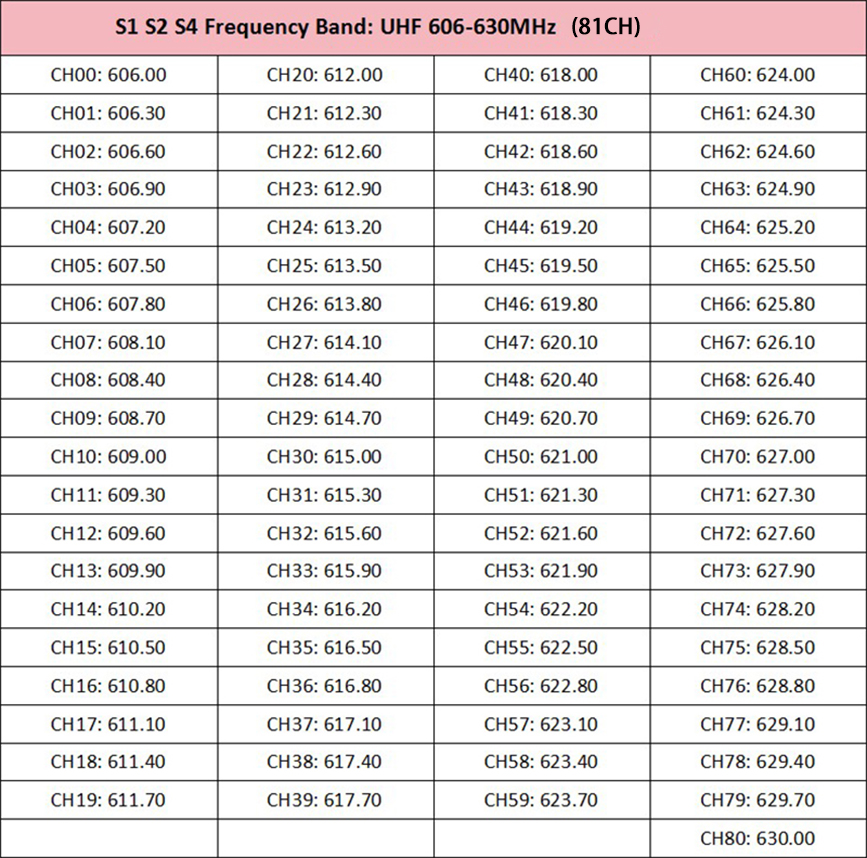 UHF technology, 30MHz bandwidth, 100 preset channels
