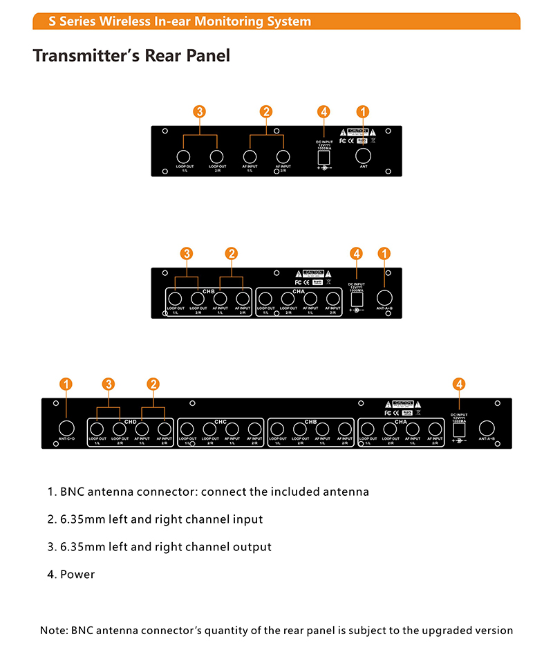 (660-690 MHz Optional), (USA: 902-928, UK: 823-832, ROK: 925-937 MHz)Modulation:IntegratedT.H.D:<0.5%@1KHzFrequency response:20Hz-20KHz(±3dB)Audio output:6.35mmφ balanced socket x2 (LOOP OUT)Audio input:6.35mmφ balanced socketx2Audio input level:+10dBu(max)Output power of earbuds for front panel of transmitter:80mW@32Ω THD+N=1%Power supply:DC 12V/1000mADisplay:IPS TFT displayDimensions (LWH):210x180x50 mm