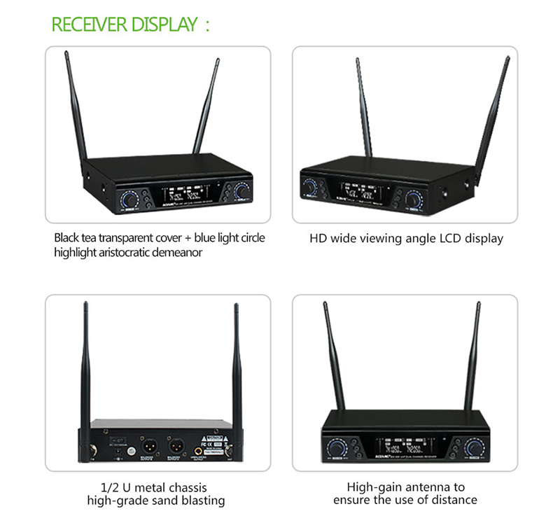 Antenna DiversityDual ChannelOperating Range: 262ft(80m)SpecificationsComprehensive PerformanceFrequency Range: UHF 600-952 MHz (region dependent)Modulation Mode: FMDynamic Range: >100dBFrequency Response: 40Hz-17KHz±3dBTotal Harmonic Distortion: <0.5% at 1KHzSignal/Noise Ratio: ≥108dBReceiverFrequency Range: UHF 660-690 MHz