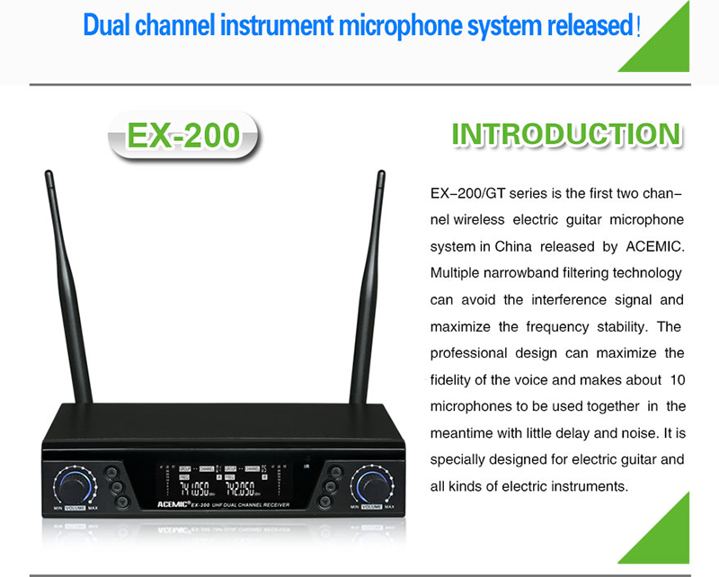 EX-200/ST-4 Dual Channel Antenna Diversity Wireless Saxophone MicrophoneExperience freedom on stage without compromising sound quality with the EX-200/ST-4, a premium wireless saxophone microphone designed for serious musicians. Whether you're performing solo, in a band, or marching in formation, this system delivers crystal-clear audio, rock-solid wireless stability, and easy-to-use features tailored for brass and woodwind instruments.