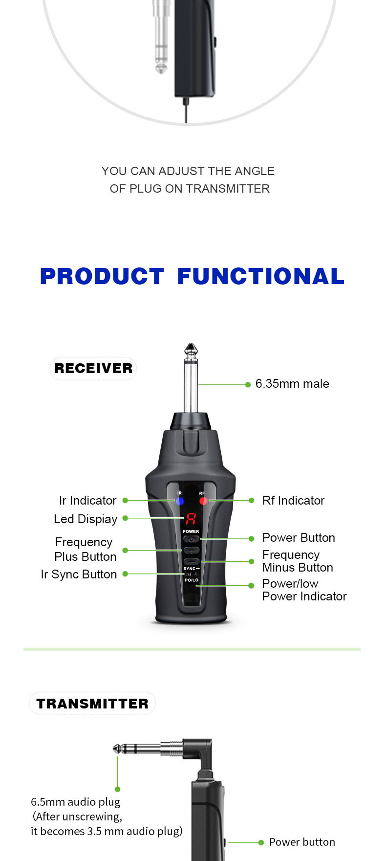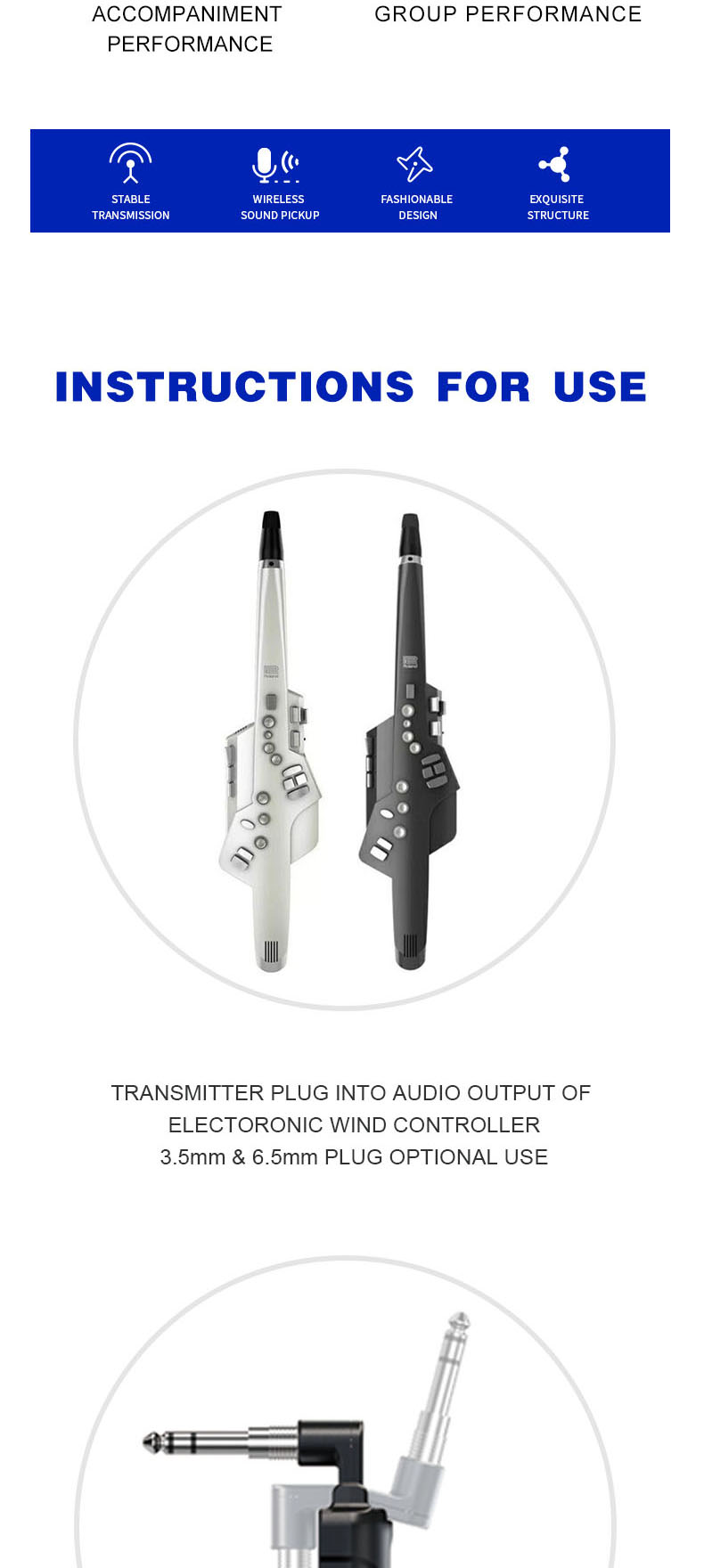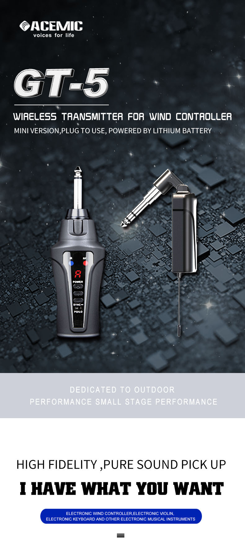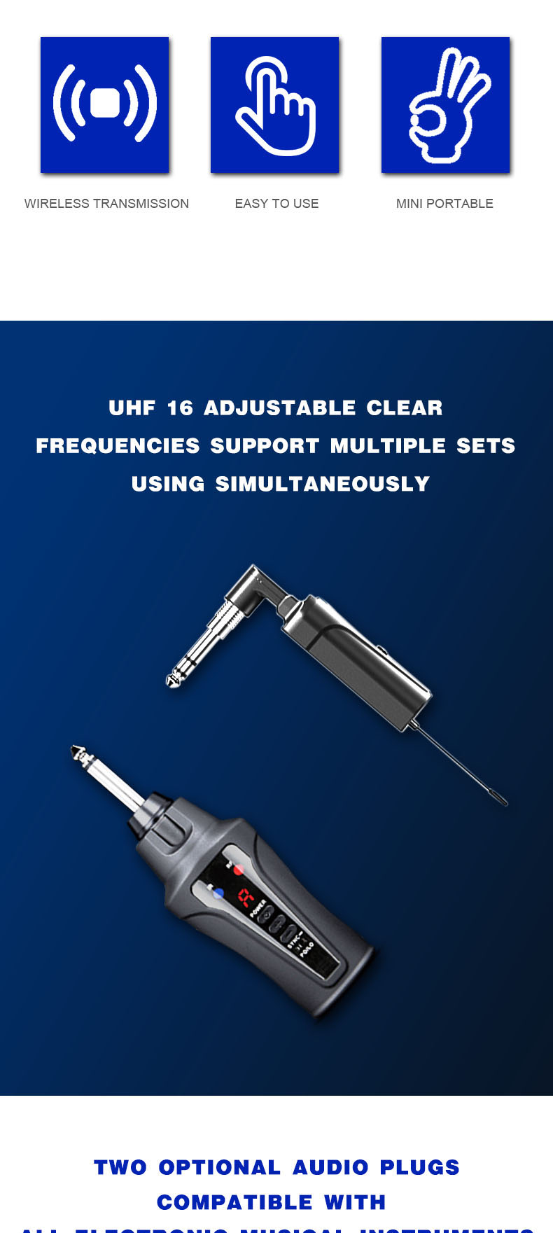 【Dual Jack Design Fits Most Instruments Securely】Whether you're shredding an wind controller, Roland Aerophone, electronic musical instrument, electric guitar, laying down bass lines, blowing into a sax, or banging out rhythms on an electric cajon, this Acemic guitar wireless system handles it all. With 6.35mm (0.25in) and 3.5mm (0.14in) jacks, it fits nearly every instrument setup. And with a matte-finished, ergonomic design, it stays securely in hand and feels as smooth as your playing.