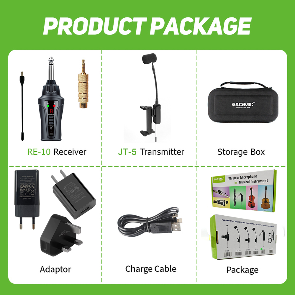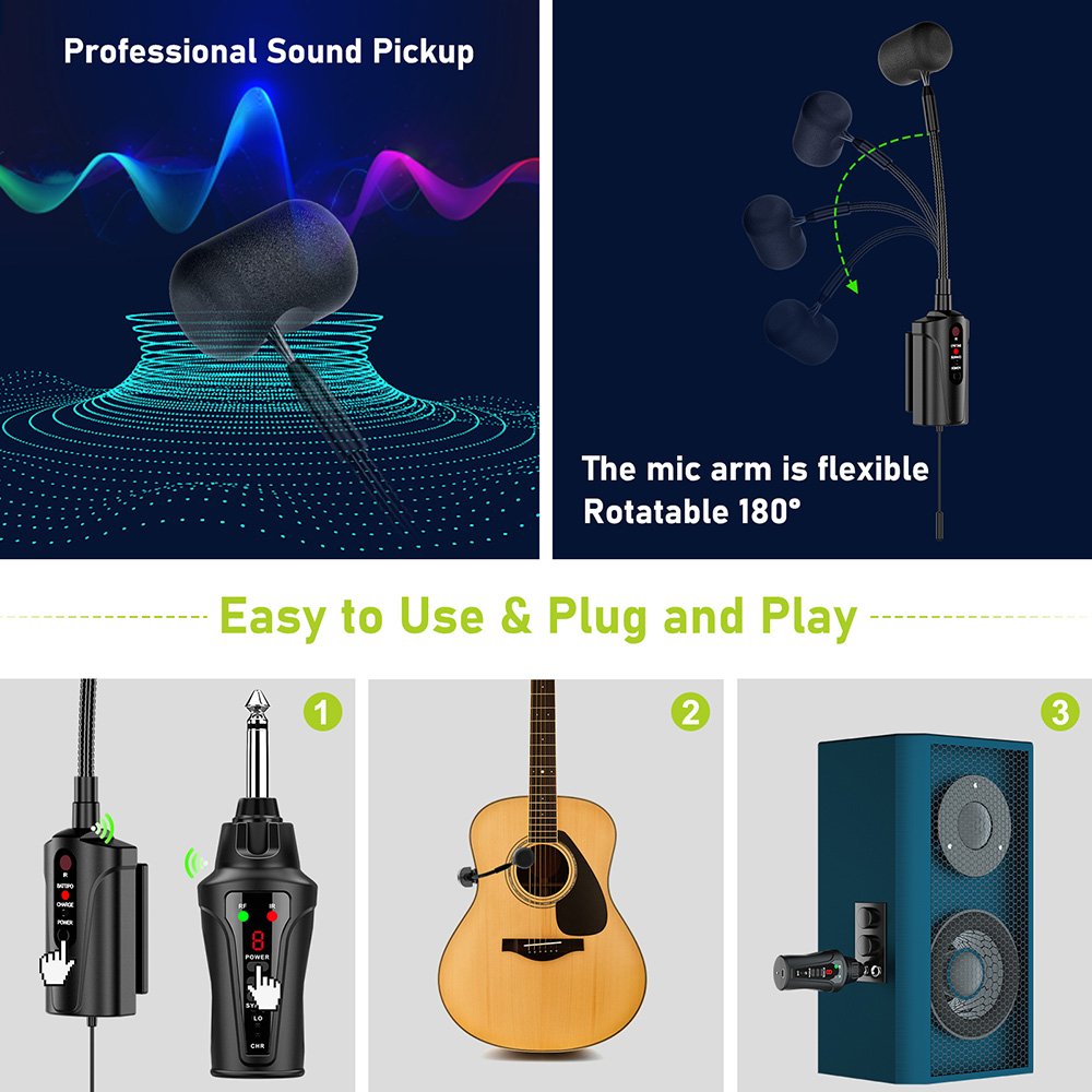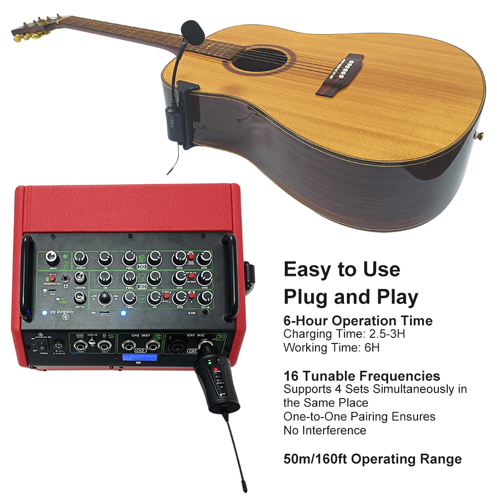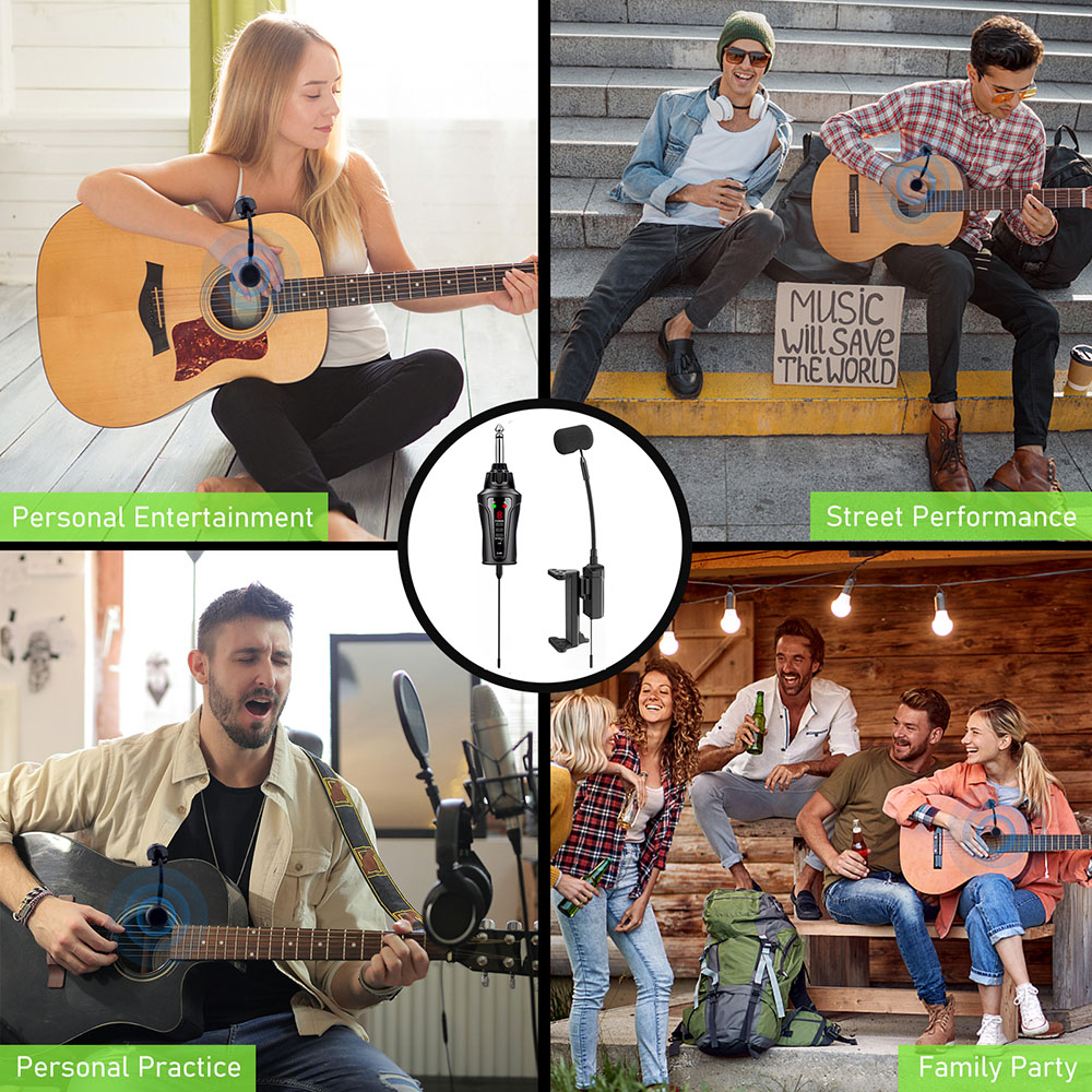 【UHF Stable Transmission】Our JT-5 wireless guitar microphone system employs UHF frequency with advanced digital audio transmission technology. It features automatic infrared pairing for seamless setup, a 48kHz sampling rate for high-fidelity sound, and minimal audio delay. Enjoy stable transmission up to 50m, 164ft in open areas. (Note: Ensure that the antenna on the receiver is correctly installed before use.)【High Quality Sound Reproduction】This JT-5 wireless guitar microphone, equipped with a built-in highly sensitive condenser microphone, perfectly captures the instrument's sound, making it clearer and more realistic. It offers 16 preset groups of adjustable channels to address potential interference issues.【Flexible Gooseneck Design】Featuring a flexible gooseneck, the JT-5 wireless guitar microphone system can easily be positioned to capture the rich tones of your guitar. Its adjustable design allows for precise placement, ensuring that every strum and note is picked up with accuracy and clarity. The clip is equipped with soft rubber to protect the acoustic guitar from damage.【Wide Application】This wireless guitar microphone is highly suitable for a variety of plucked string instruments, including classical and acoustic guitars. The package includes a 6.35mm to 3.5mm adapter for use with various portable PA systems, speakers, amplifiers, audio mixers, and more. It also comes with a carrying bag, making it convenient to carry wherever you perform.【Multi-scenario】The versatile wireless guitar microphone is ideal for a range of performances, including live gigs, solo performances, accompaniment performances, personal entertainment, school stage performances, personal practices, and small concerts. And you can use 4 systems simultaneously within the same frequency band.