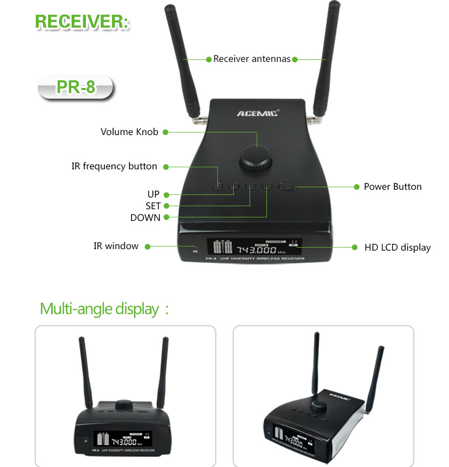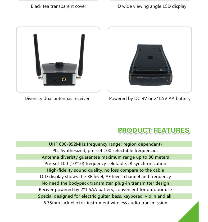 SpecificationsComprehensive PerformanceFrequency Range: UHF 600-937 MHz (region dependent)Modulation Mode: FMDynamic Range: >100dBFrequency Response: 40Hz-17KHz±3dBTotal Harmonic Distortion: <0.5% at 1KHzSignal/Noise Ratio: ≥105dBReceiverFrequency Range: UHF 660-690 MHz
