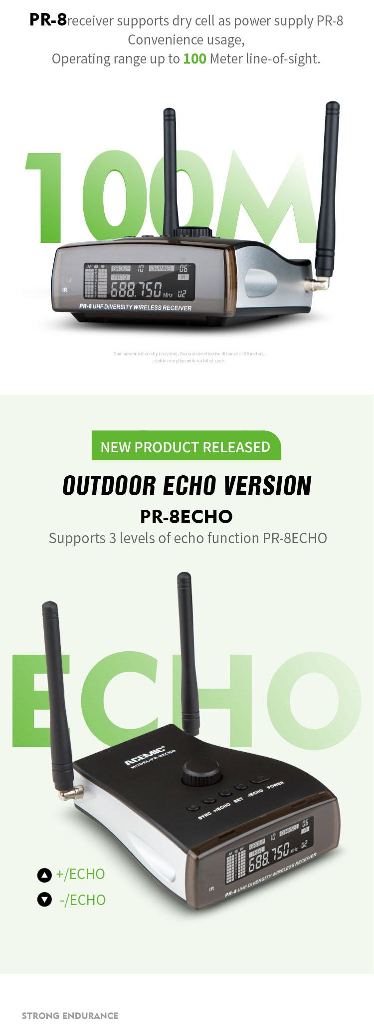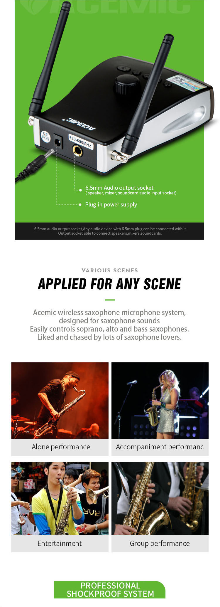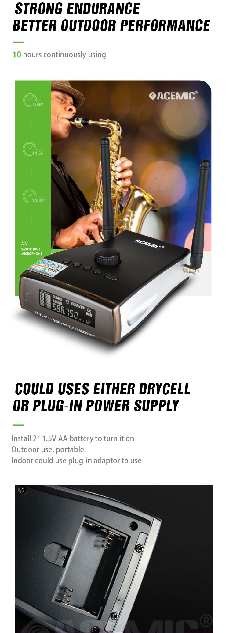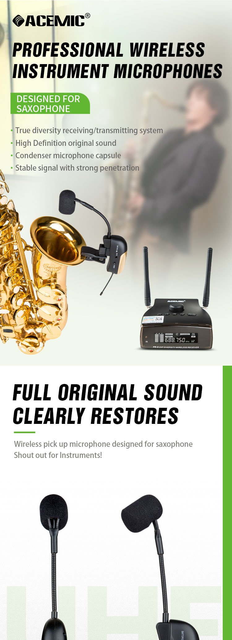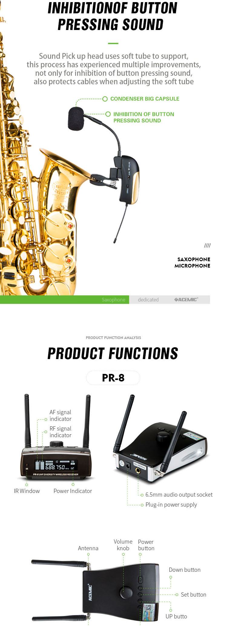 • The wireless saxophone microphone comes with basic 3-level ECHO, 100 preset UHF channels (600-937 MHz), and LCD Indicators with crucial information such as RF/AF Signal, Group, Channel, Frequency, Battery Level.