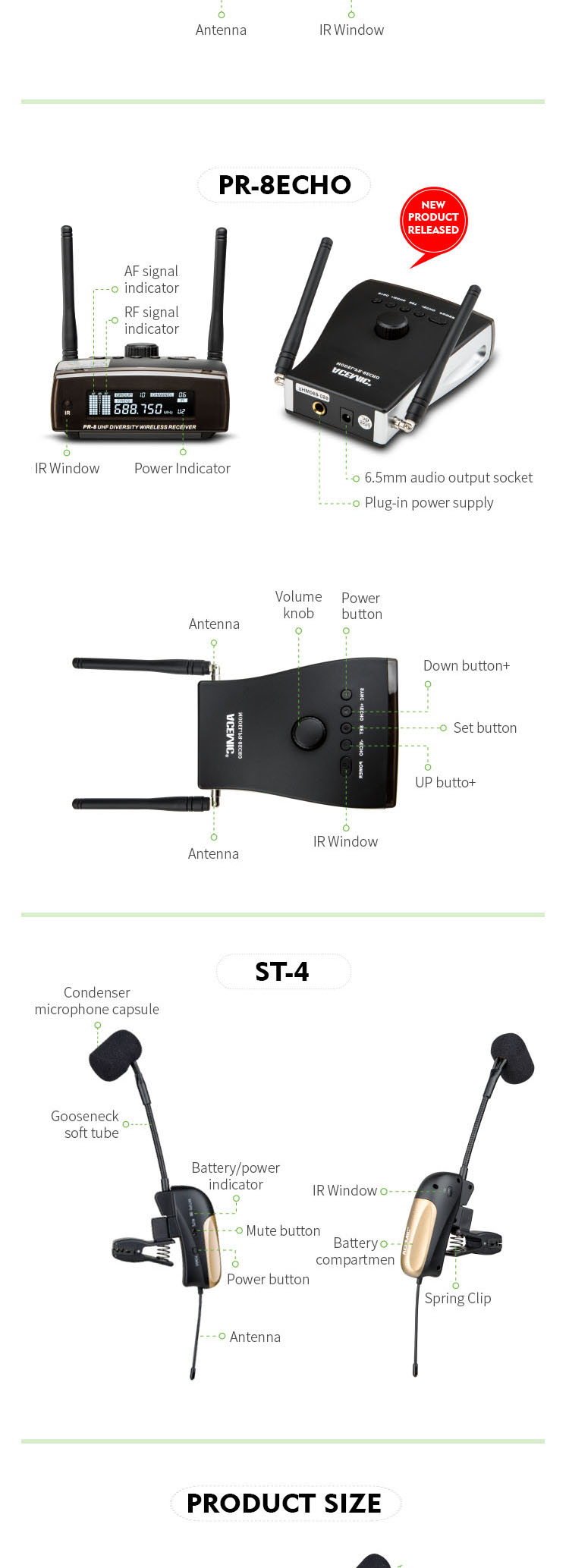 (606-630 MHz Optional), (USA: 902-928, UK: 863-865, ROK: 925-937 MHz)RF Power: 10mWMicrophone Type: CondenserDirectionality:CardioidDeviation: ±48KHzAntenna: 1/4 wave Length wire typeBattery Voltage: 1.5V (1x1.5V AA Battery)Power Consumption: 10 hours, battery-dependent