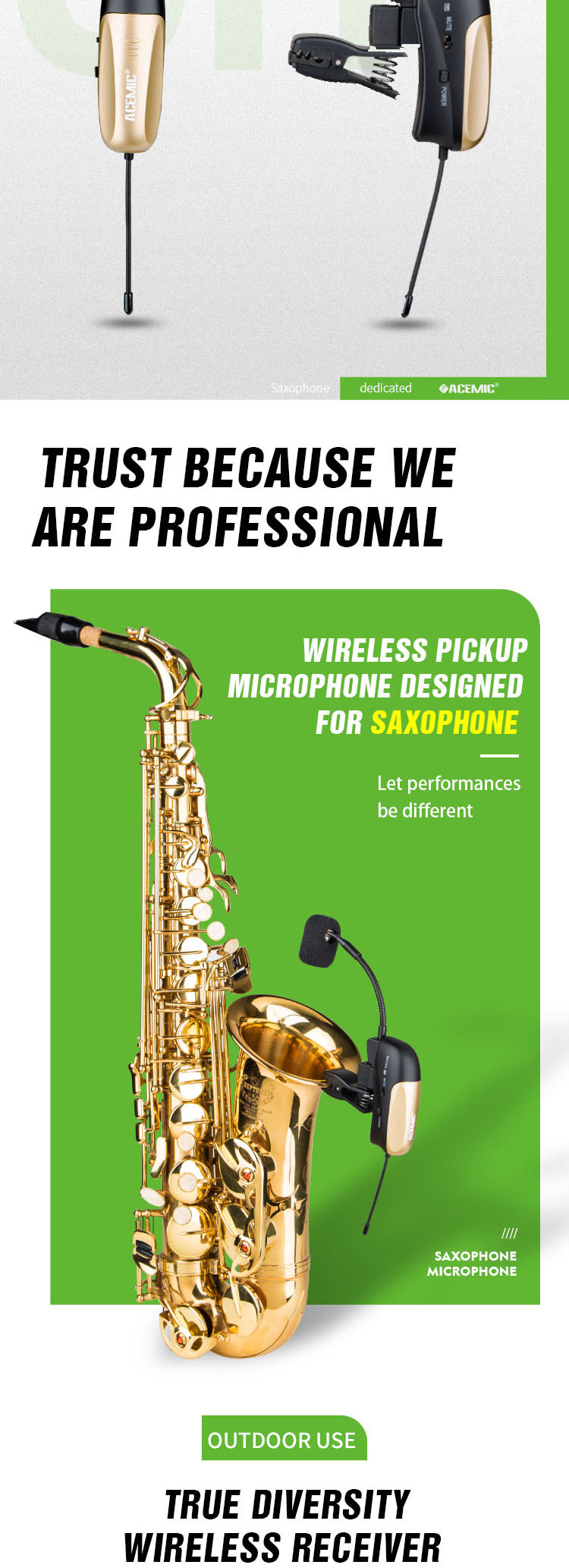 About this item:• The wireless saxophone microphone frees yourself from cables and experience the ultimate freedom while performing! A reliable and compact system with professional features and exceptional audio quality that you can take anywhere with you.• Rugged, stompbox-size receiver can be placed anywhere you choose— even on stage next to your effects pedals. Can be powered either with included AC adapter or with 2 AA batteries for added portability.• Antenna Diversity (dual antenna system) guarantees the best possible range. UHF band operation and gold plated 1/4” output for optimal sound quality. The wireless saxophone microphone's bright display with frequency indication (including group & channel), audio & RF meters and battery status.• Mini transmitter lamps connects to the bell of your horn – No chords necessary! The wireless saxophone microphone features a MUTE switch for conveniently silencing the transmitter while the system is on to avoid popping sounds during performances.