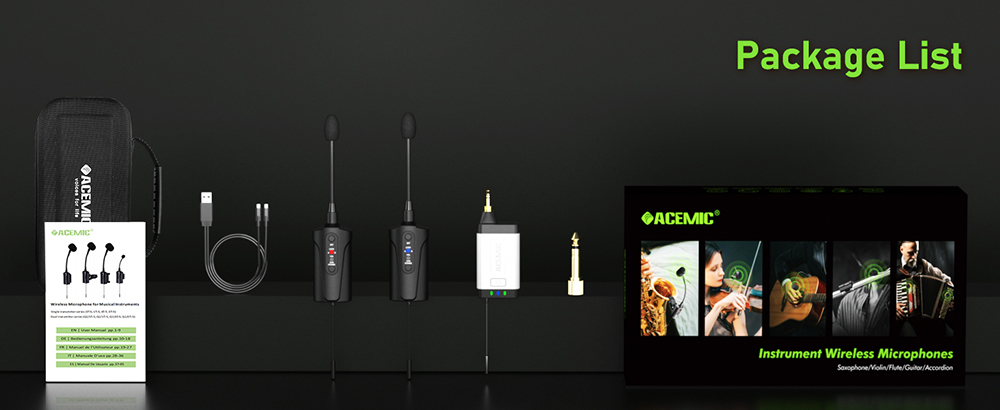 【6 Hours Continuous Use Time】The wireless flute microphone, which includes 2 transmitters and 1 receiver, each with a built-in rechargeable battery,offers 6 hours of continuous use on a single charge after a 2.5 to 3 hours charging time. Included in the package is a 2-in-1 charging cable for charging both the transmitter and receiver simultaneously. Ideal for gigs, weddings, church services, teaching, band performances, pub performances, solo musician performances, and small concerts.