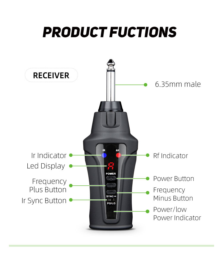 (606-630 MHz Optional), (USA: 902-928, UK: 863-865, ROK: 925-937 MHz)Frequency: Pre-set 16 selectable channelsModulation mode: pi/4 DQPSKLatency: <6msSampling: 48KHzFrequency response: 60Hz - 15KHz ± 2dBTotal Harmonic Distortion: <0.8%(1KHz)Signal/noise ratio: >92dBReceiving sensitivity: -92dBmOutput: 6.35mm plugPower supply: 3.7V Lithium batteryPower consumption: >6 hours continuosly usingDimensions: 185*20*10mmTransmitterFrequency range: UHF 660-690 MHz