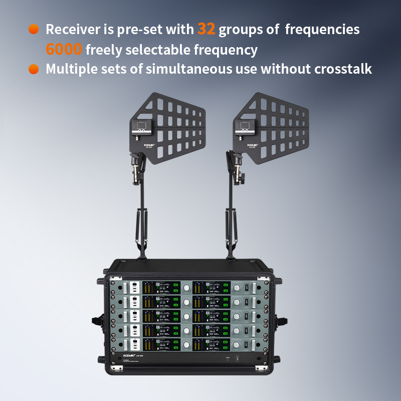 UHF range, 60MHz bandwidth allows 32 pre-set channel groups and 6000 frequencies to be used.