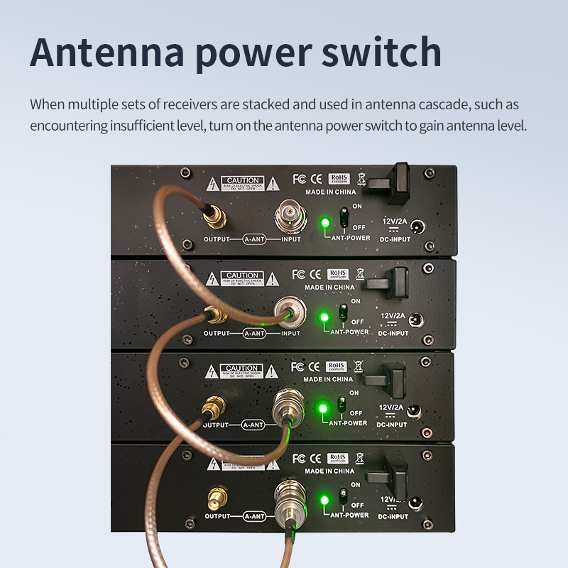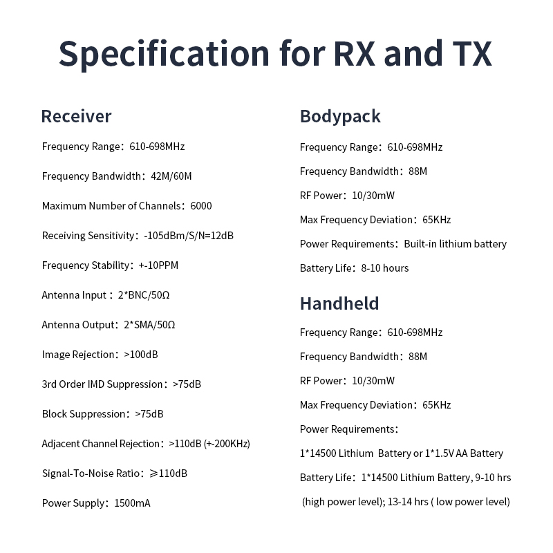 (610-640 MHz Optional), (USA: 902-928 MHz, ROK: 925-937 MHz)Frequency Bandwidth:42MHz/60MHzMaximum Number of Channels:6000Receiving Sensitivity:-105dBm/S/N=12dBFrequency Stability:+-10PPMAntenna Input :2*BNC/50ΩAntenna Output:2*SMA/50ΩImage Rejection:>100dB3rd Order IMD Suppression:>75dBBlock Suppression:>75dBAdjacent Channel Rejection:>110dB (+-200KHz)Signal-To-Noise Ratio:≥110dBPower Supply:1500mAHandheld TransmitterFrequency Range:UHF 610-698 MHz(610-640 MHz Optional), (USA: 902-928 MHz, ROK: 925-937 MHz)Frequency Bandwidth:88MHzRF Power:10/30mWMax Frequency Deviation:65KHzPower Requirements:1*3.7V/14500 Li-ion Battery or 1*1.5V AA BatteryBattery Life: Standard 14500 Li-ion battery, 9-10 hrs (high power level); 13-14 hrs ( low power level)Bodypack TransmitterFrequency Range:UHF 610-698 MHz(610-640 MHz Optional), (USA: 902-928 MHz, ROK: 925-937 MHz)Frequency Bandwidth:88MHzRF Power:10/30mWMax Frequency Deviation:65KHzPower Requirements:2*1.5V AA batteryBattery Life:8-10 hours