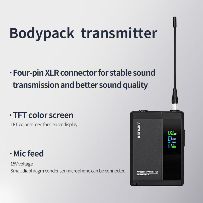Bodypack supports 15V voltage, compatible with lavalier/headset and may connect to small diaphragm condenser mic.