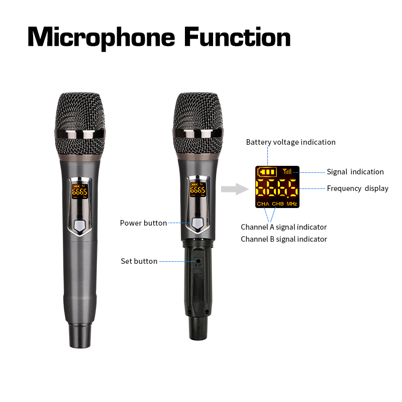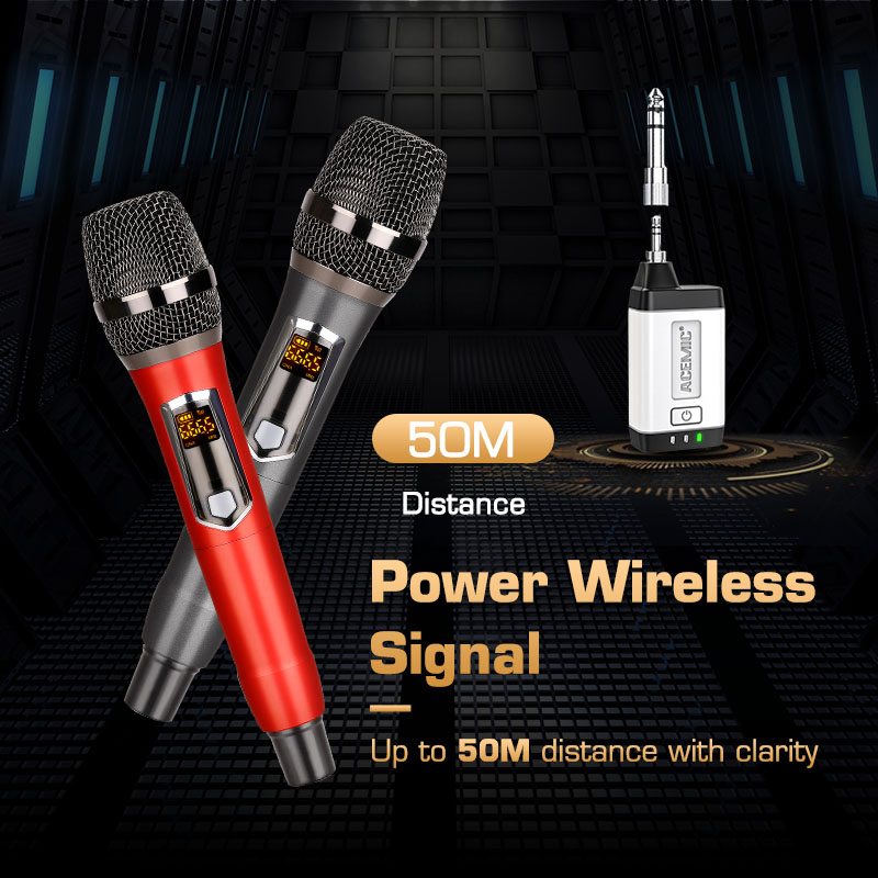 About this item:【UHF Digital Technology】The portable wireless microphone system features professional automatic frequency technology, which can provide stable sound transmission, fast and constant frequency, with up to 20 optional frequency channels. Support 5 sets at max for simultaneously using in the same area, (Each Set Using In Different Channel), avoiding interference signals at any time. Up to 164ft (50m) line-of-sight range【 Rechargeable & LED Display】The receiver can be rechargeable. No need to set! The transmitter requires 2 AA alkaline batteries which can last for about 8 hours, the receiver's lithium battery can last for 6 hours. The wireless handheld microphone has a LED display, so you can clearly see the battery, channel and signal., don't worry about suddenly not working.【Compatible with Multiple Devices】The portable wireless microphone system is designed for devices with with 'MIC INPUT' (6.35mm (1/4") or 3.5mm (1/8") MIC input). Works with karaoke machine, mixer, singing machine, audio amplifier, PA system, powered speaker, voice amplifier, and more streaming Multimedia Equipment.【Plug and Play Microphone】No need pair. The portable wireless microphone system is only for input devices with 6.35mm (1/4") or 3.5mm (1/8") MIC interface, speaker, Singing machine, audio amplifier, PA system, Voice amplifier, truck speaker system, Dome speaker system etc, no need to connect the output line separately. Really easy to use. (NOTE: the portable karaoke mic is not compatible with phones, computers and tablets.)【High-Quality Materials】The portable wireless microphone system adopts metal aluminum tube, and the net head is made of metal baking varnish, which is has strong impact and corrosion resistance safe and fall-proof and sturdy.The microphone system with excellent appearance, high-quality materials, easy to use, will be a great gift for family or friends!