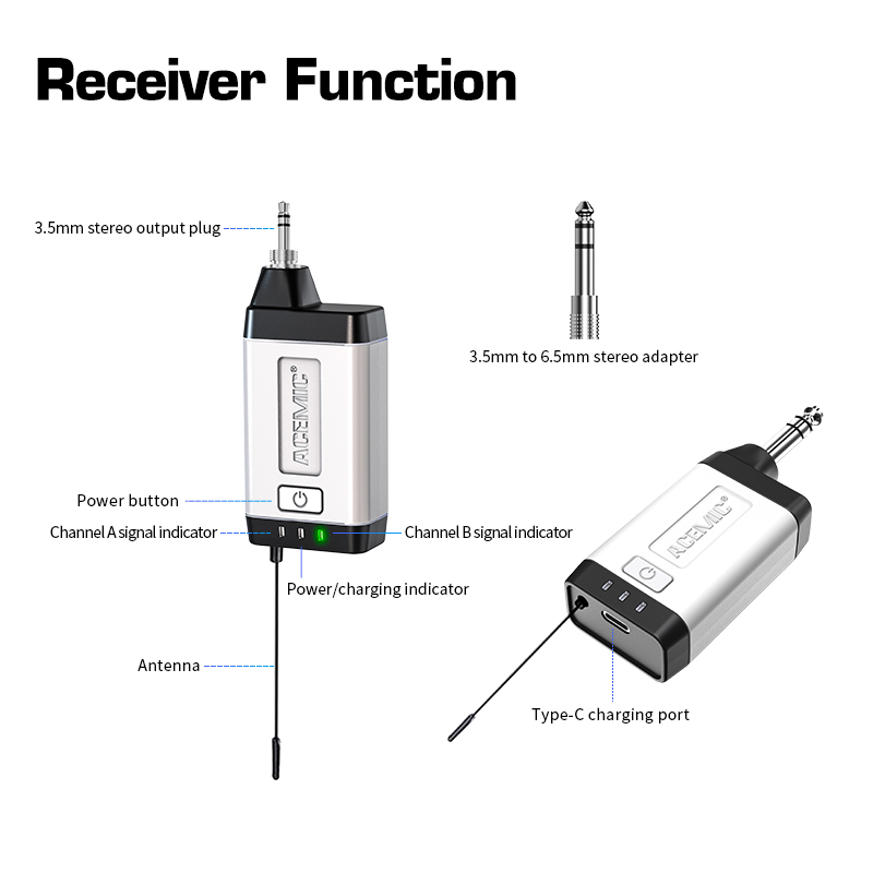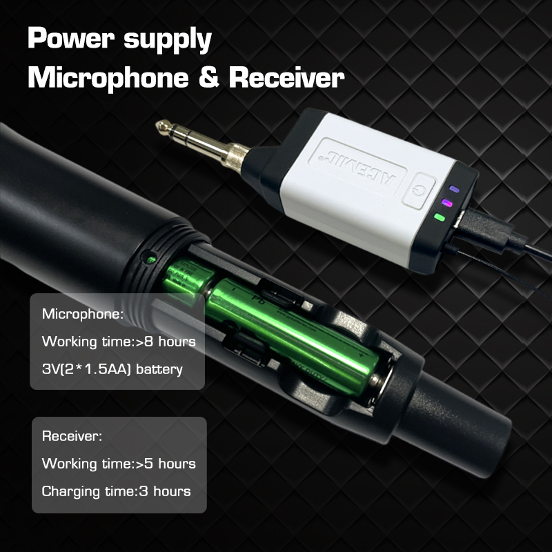 SpecificationsReceiverFrequency Range: UHF 660-690MHz (USA: 902-928MHz)Channels:Pre-set 20 frequenciesDemodulation mode:Pi/4 DQPSKTransmission delay:<6msSampling Rate:48KHzFrequency response:60Hz-15KHzDistortion:<0.8%(1KHz)Signal / Noise Ratio:>92dBReceive Sensitivity:-92dBmOutput interface:3.5 mm TRSPower supply:3.7V lithium batteryBattery life: 6 hoursTransmitterFrequency range: UHF 660-690MHz (USA: 902-928MHz)RF Power:10mWDemodulation mode:Pi/4 DQPSKFrequency switching:Key switchingMicrophone type:DynamicMaterial:Metal tube bodyBattery voltage:3V (2*1.5V AA)Battery life:>8 hoursSize:257mm