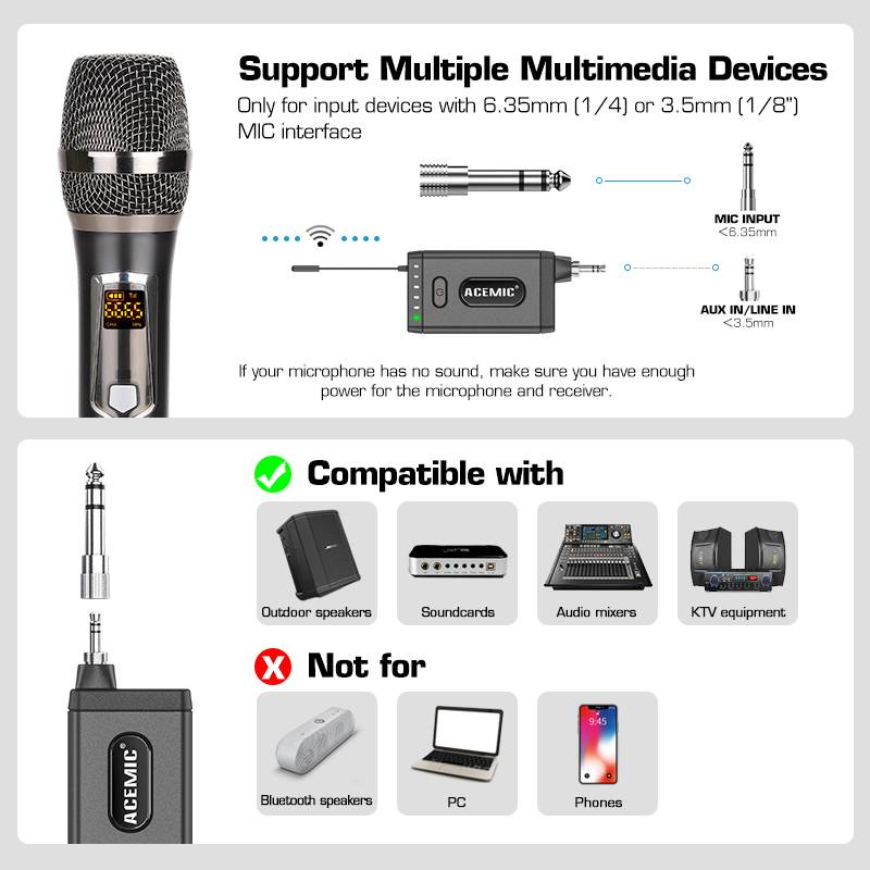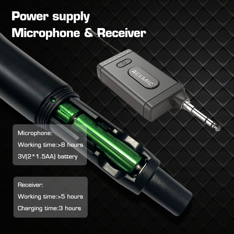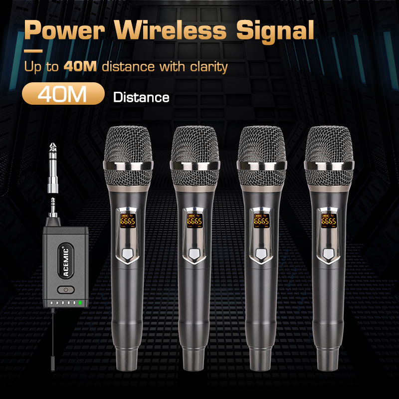About this item:【Truly Wireless Freedom】Enjoy an exceptional line-of-sight range of up to 164 feet (50m) with the UHF 4 channel wireless microphone system. The receiver features a unique antenna design for a reliable signal, so you won't have to worry about the sound cutting in and out during use. The wireless microphone system allows you to move freely during performances. Ideal for a variety of events such as family karaoke, singing, small gigs, DJ parties, church, weddings, speeches, small theaters, live broadcasts, and presentations.【Clear and Pristine Sound Quality】The 4 channel wireless microphone system comes with high quality dynamic cartridge of each microphone is specially engineered to limit feedback and interference, picking up sound smoothly and transmitting sound hassle-free. Deliver clear, robust, optimal true sound, ensuring a pure and immersive audio experience.【Sturdy and Durable】The 4 channel wireless microphone system adopts all-metal mic head and steel mesh grille, is particularly resistant to impact and corrosion. Its robust internal architecture can withstand the impacts and abuse encountered during heavy use. The handle is designed with a rubber oil feel, ensuring a comfortable and secure grip when held.【6 Hours Long Working Time】Each handheld microphone is powered by 2 AA batteries, ensuring up to 6 hours of working time (AA Batteries NOT INCLUDED). The receiver, with its built-in rechargeable battery, enables up to 5 hours of continuous working time on a single charge.【Plug and Play】The wireless microphone system features a 4-channel pre-set frequency and automatically pairs with the receiver. Simply plug the UHF receiver into the 6.35mm(1/4") or 3.5mm(1/8") input interface of your audio equipment, such as a karaoke machine, audio/voice amplifier, mixer, portable speaker, live sound card. Even first-time users can get started smoothly.