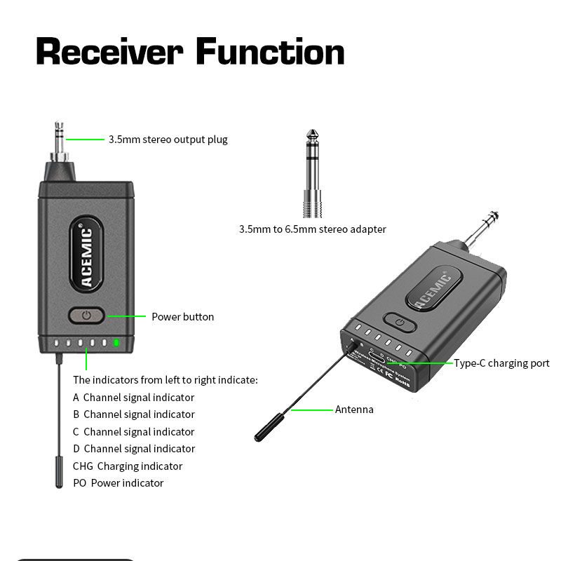 SpecificationsReceiverFrequency Range: UHF 660-690MHz (USA: 902-928MHz)Channels:Pre-set 4 frequenciesDemodulation mode:Pi/4 DQPSKTransmission delay:<6msSampling Rate:48KHzFrequency response:60Hz – 15KHz±2dBDistortion:<0.8%(1KHz)Signal / Noise Ratio:>92dBReceive Sensitivity:-92dBmOutput interface:3.5 mm TRSPower supply:3.7V lithium batteryContinuous using time:5 hoursTransmitterFrequency range: UHF 660-690MHz (USA: 902-928MHz)RF Power:10mWDemodulation mode:Pi/4 DQPSKChannel switch:Key switchingMicrophone type:DynamicMaterial:Metal tube bodyBattery voltage:3V (2*1.5V AA)Continuous using time:>6 hoursSize:257mm