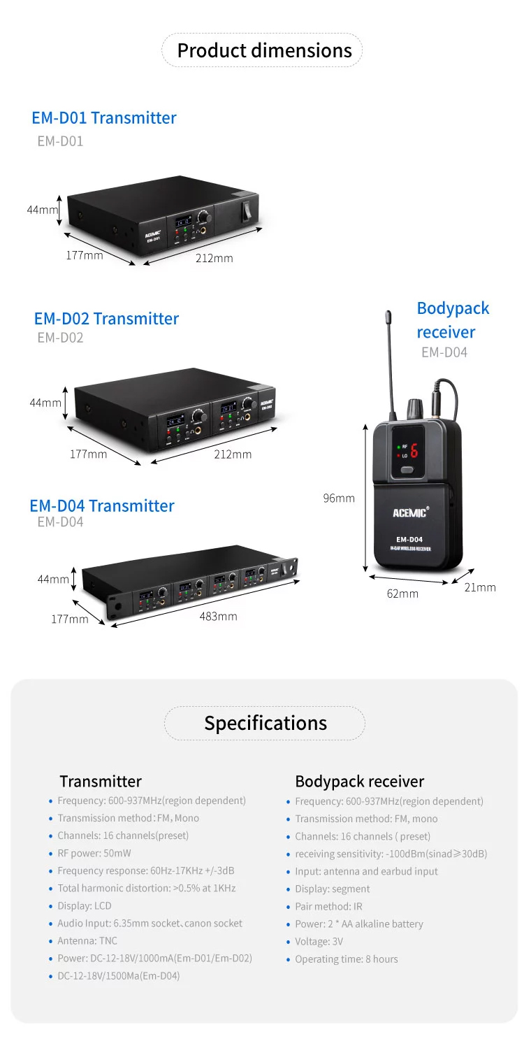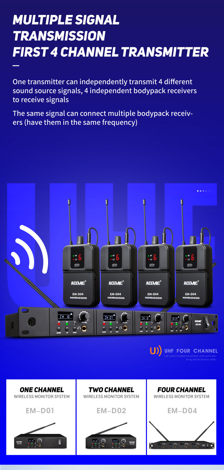 About this item:【Wireless Performance】The wireless in-ear monitor system operates in UHF band with 16 selectable frequencies ( 4+ units can work together). No Latency by utilizing UHF wide audio signal transmission. Wireless design for less clutter on stage, enables users to move freely with 263ft (80m) operating distance in open space, line of sight. *For longer distance, please avoid thick walls, glass, and metal block.【Mono Design, Separate Outputs】Elegant sleek design with metal construction for transmitter base unit. Black carrying case for safe-keeping. Left and right inputs for personal audio mix with clear mono sound monitoring. The wireless in-ear monitor system also runs a left/right line out back to the soundboard or speaker. It allows original audio signal pass through the EM-D01 transmitter without being affected【Simple Setup】Simple setup with uninterrupted frequency to optimize sound performance for the wireless in-ear monitor system. Earbuds provide pure sound and enhanced performance.【Versatile Use】The wireless in-ear monitor system works in various sound-monitoring events, stage performance, studio recording, exhibit, lecture, instruction, speech, etc. The package also includes necessary tools to work with standard rack unit.【Box Contents】 1 x Wireless IEM Transmitter, 1 x UHF Bodypack Receiver,1 x Power Adapter, 1 x Antenna, 2 x AA Battery, 1 x Antenna Kit, 1 x User ManualPurchase with Confidence: EM-D01 wireless in-ear monitor system is crafted with premium components and precision engineering, ensuring trusted quality and lasting reliability. We stand firmly behind every product we make.
