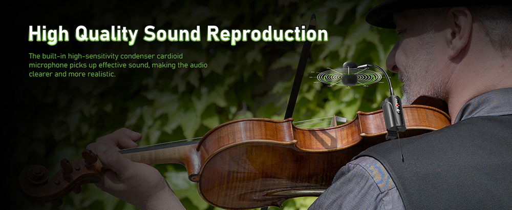 【High Quality Sound Reproduction】The Q2/VT-5 wireless violin microphone's transmission distance reaches 164 feet (50 meters). Equipped with a built-in highly sensitive condenser microphone, it perfectly captures the instrument's sound, delivering clearer and more realistic audio. It features infrared automatic pairing, a 48kHz sampling rate, and an ultra-short audio delay.
