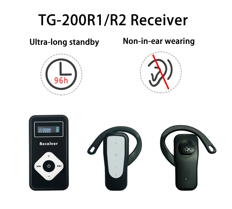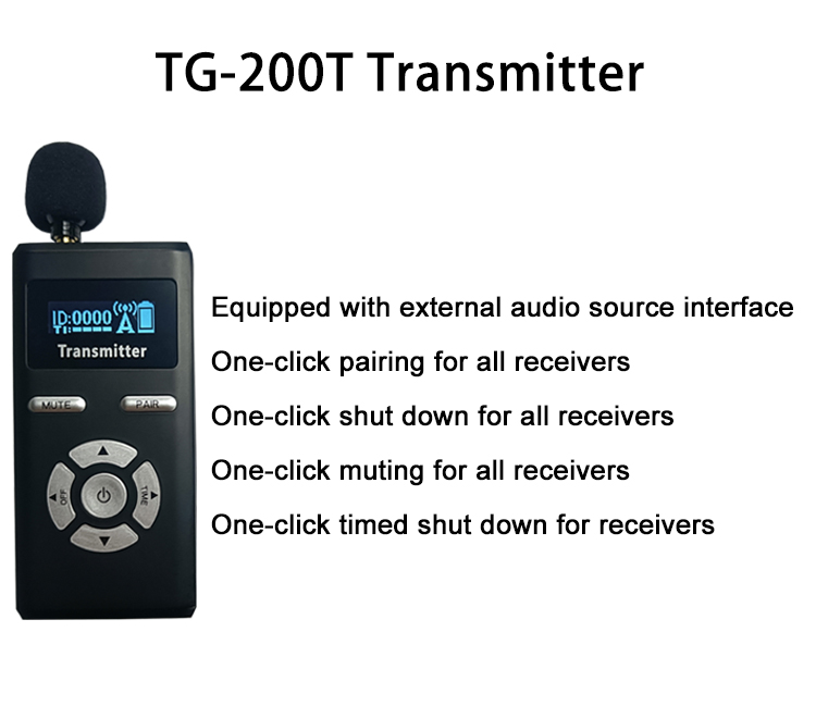 DetailModel: TG-264ETotal: 64PCS (4PCS Transmitters, 60PCS Receivers), 64-Slot Charging CaseNote: This system requires a human language interpreter, it does not translate automatically.