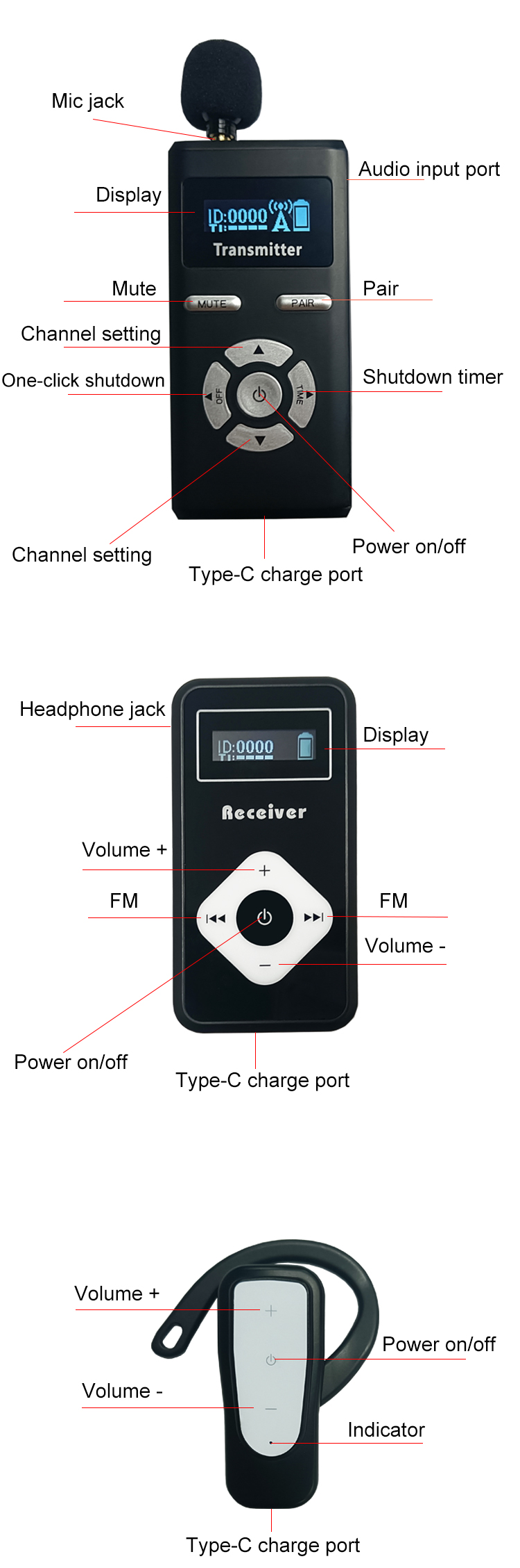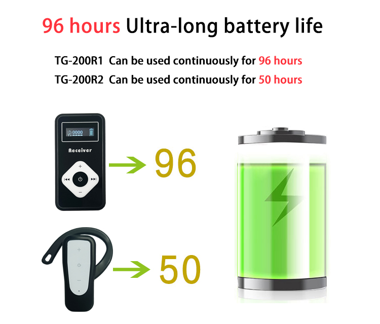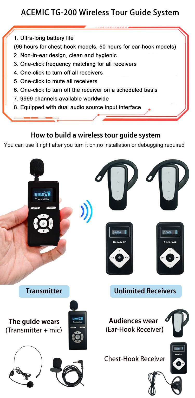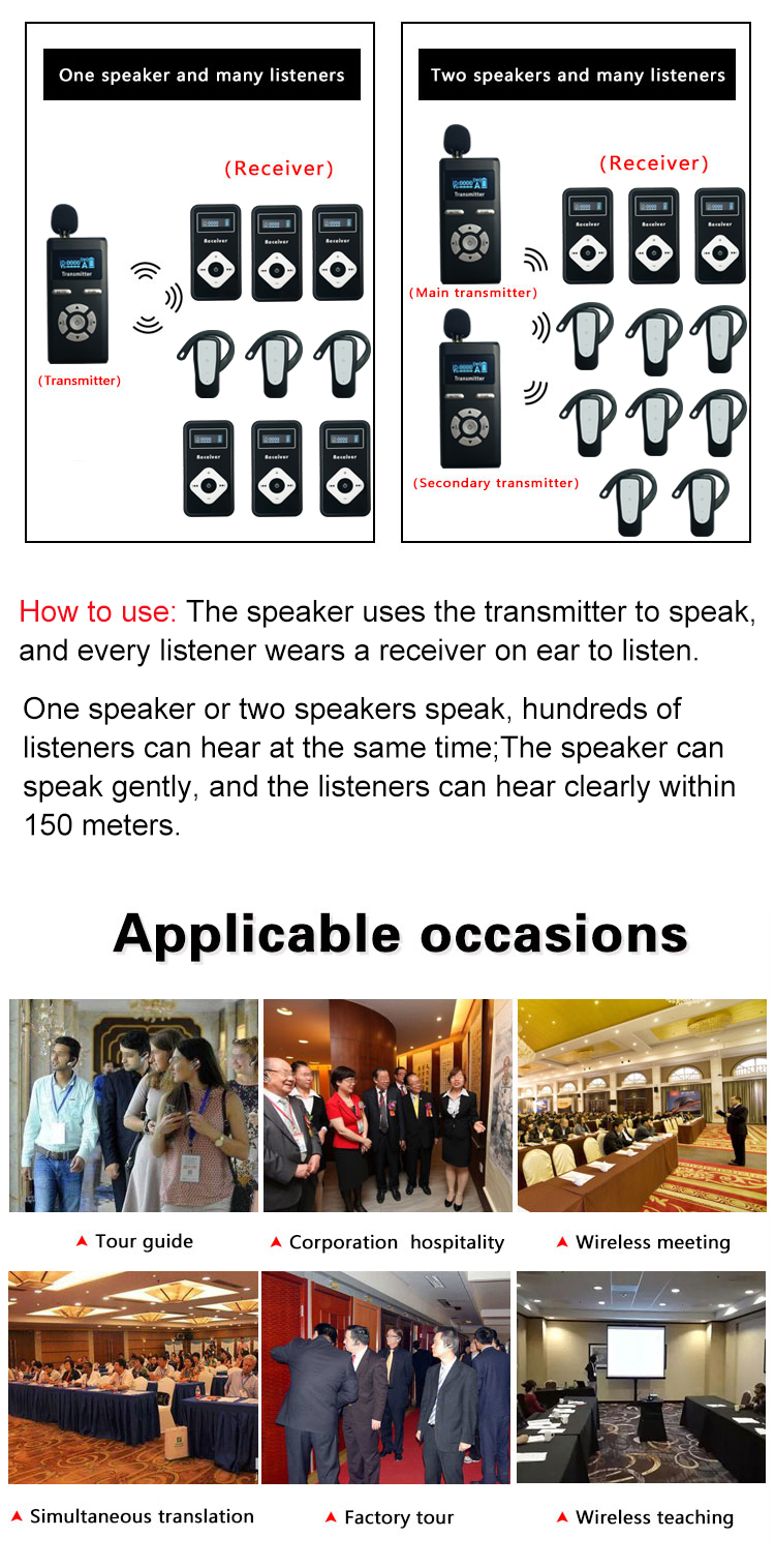 About this item:【Receivers Could Hear Voice from 2 Transmitters Simultaneously】The wireless tour guide system could help the presenter transmit audio voice messages to an audience at a comfortable level without having to shout. The presenter speaks into a mic-transmitter and the audience use lightweight ear-hook receivers to hear the message.What makes it amazing is that receivers could hear voice messages from two transmitters on the same channel,it means that each group support two presenters speaking simultaneously.【Varied Applications】The wireless tour guide system is used when it is difficult for an individual to talk to listeners due to noise or distance. Popular uses are: Factory and plant tours or tours in other noisy environments, Simultaneous translation for multilingual meetings(church or conference),Portable audio description( performing arts such as theatre or dance, or at sporting events),Command Training,Square Dance, .job/sports training, silent commentary.【Advantage Features】The wireless tour guide system enables up to two presenters to talk on the same channel in each group, allowing them to take turns at regular intervals to reduce fatigue.Transmitter also has an AUX input which enables to connect a MP3, Smartphone,MP4 to the system.When presenter speaking with main microphone transmitter,the deputy transmitter could send background music or pre-recorded voice files to receivers.Hundreds of tour groups can operate simultaneously in the same area.【Key Datas】The wireless tour guide system features 9999 Selectable 2.4GHz licence-free world-wide channels accommodating hundreds of groups working on the same place as long as they are on different channels.Used a comfortable level volume to be heard clearly in a noisy environment or over distance.Transmission distance could be up to 120 meters/394ft.The transmitter has mute function.If the interpreter sometimes does not want the audience to hear his speech, he can press the mute button and the audience will not hear his speech.【More detail】The wireless tour guide system's transmitter has built-in 900mAh lithium battery which could be used for 25 hours and receiver built-in 380mAh lithium battery for 23 hours after full charged. Ear-hook receiver only weight 25g and transmitter weight for 75g. Each little device comes with its own charger and lanyard for complete hands-free operation.Receiver could match transmitter's channel automatically,needn't operate one by one.Transmitter could turn off all connected receivers by one click.